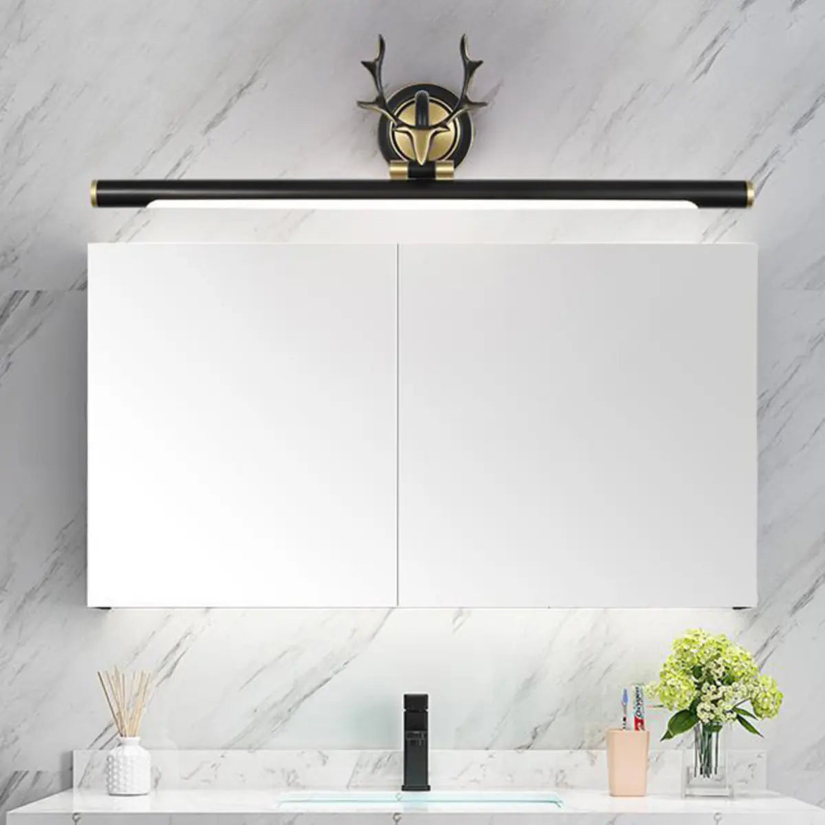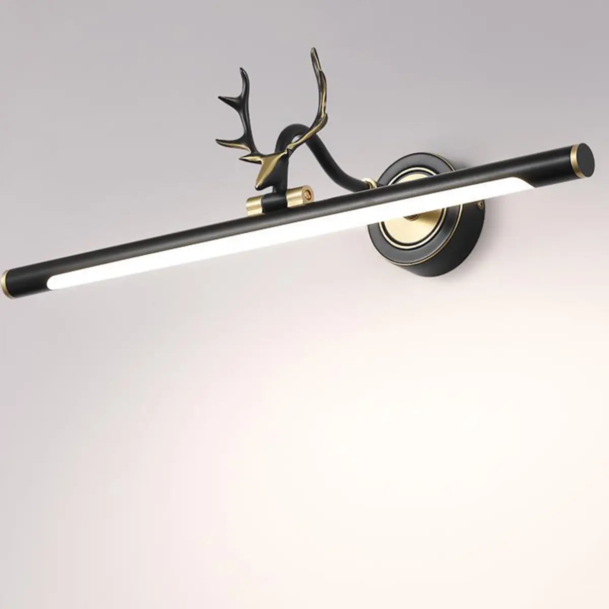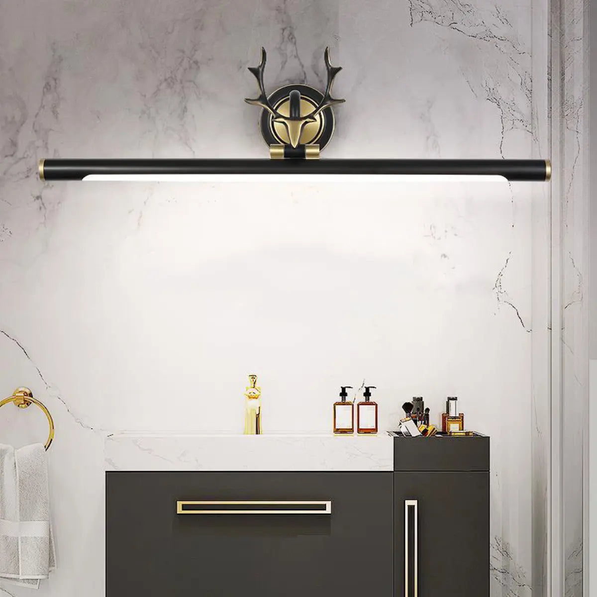 This modern bathroom wall light cleverly combines art and functionality. With an elegant antler design, it is not only a lamp but also a stunning decorative piece. Its simple black appearance with gold details is ideal for a variety of home styles, adding a unique aesthetic to your bathroom.