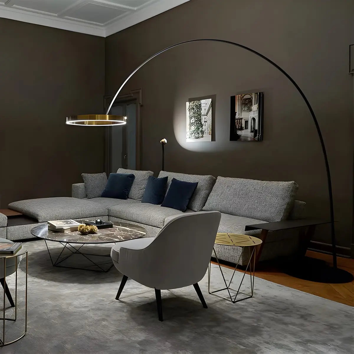 This floor lamp has a modern design, perfectly combining the sophistication of metal materials with curved lines, highlighting a simple and contemporary style.