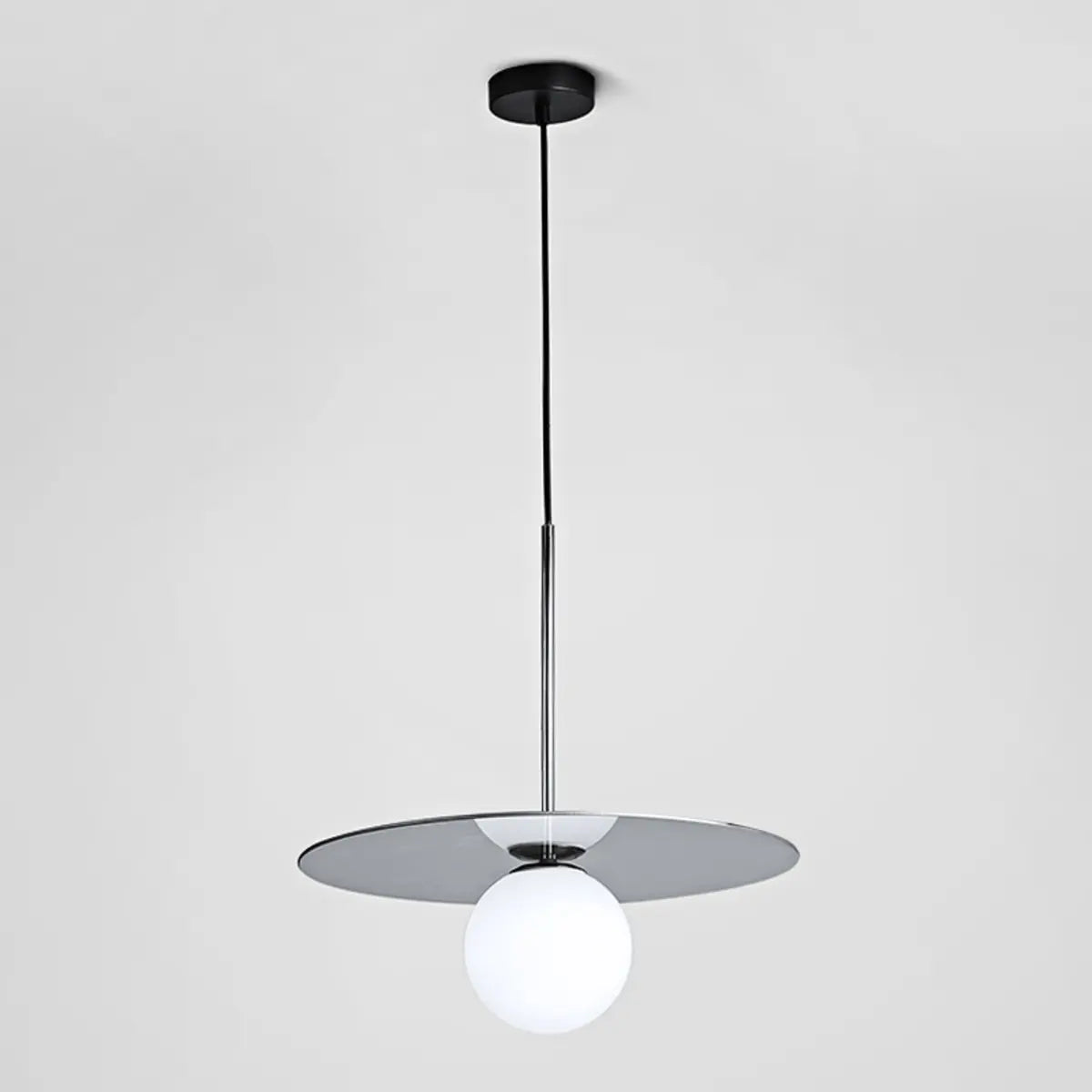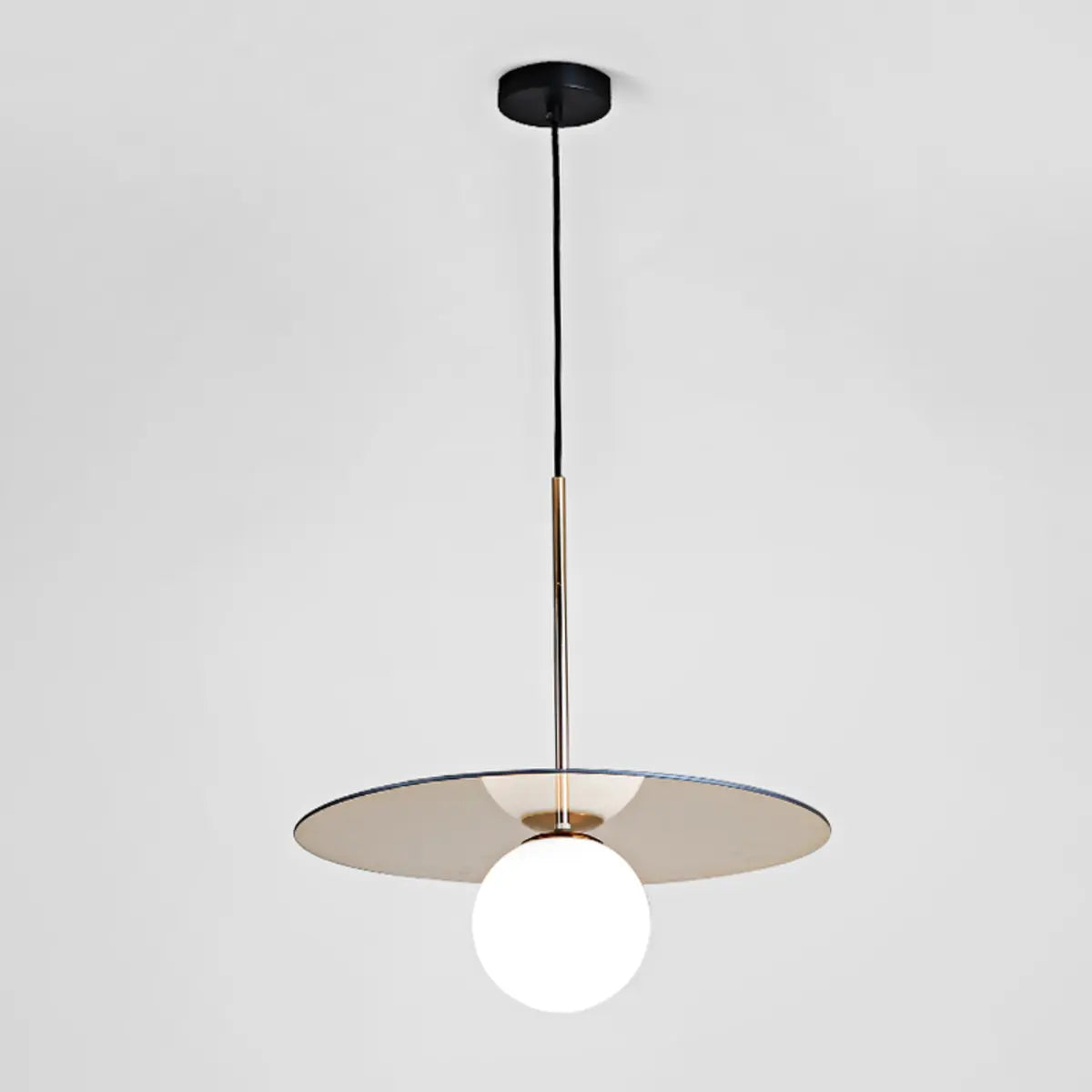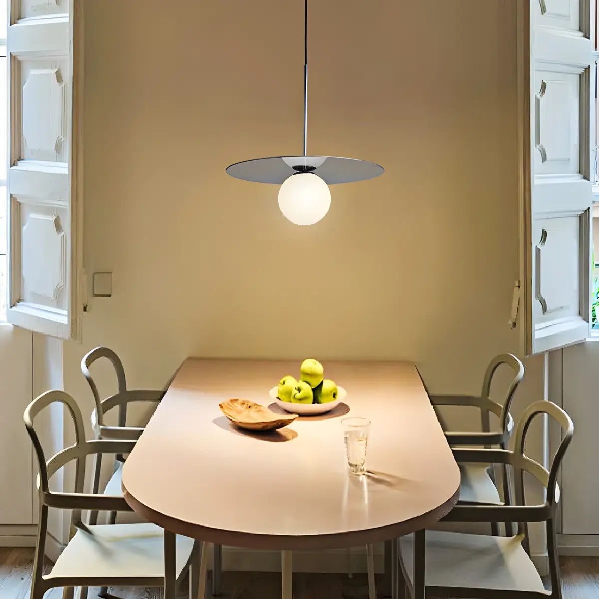 This modern pendant lamp features a simple geometric design, combining an elegant round lampshade with metal details to create a unique visual centerpiece. Its white or amber glass lampshade gives the light a soft and warm atmosphere. It is both a lighting fixture and an interior art piece, perfectly enhancing the aesthetic value of the kitchen.