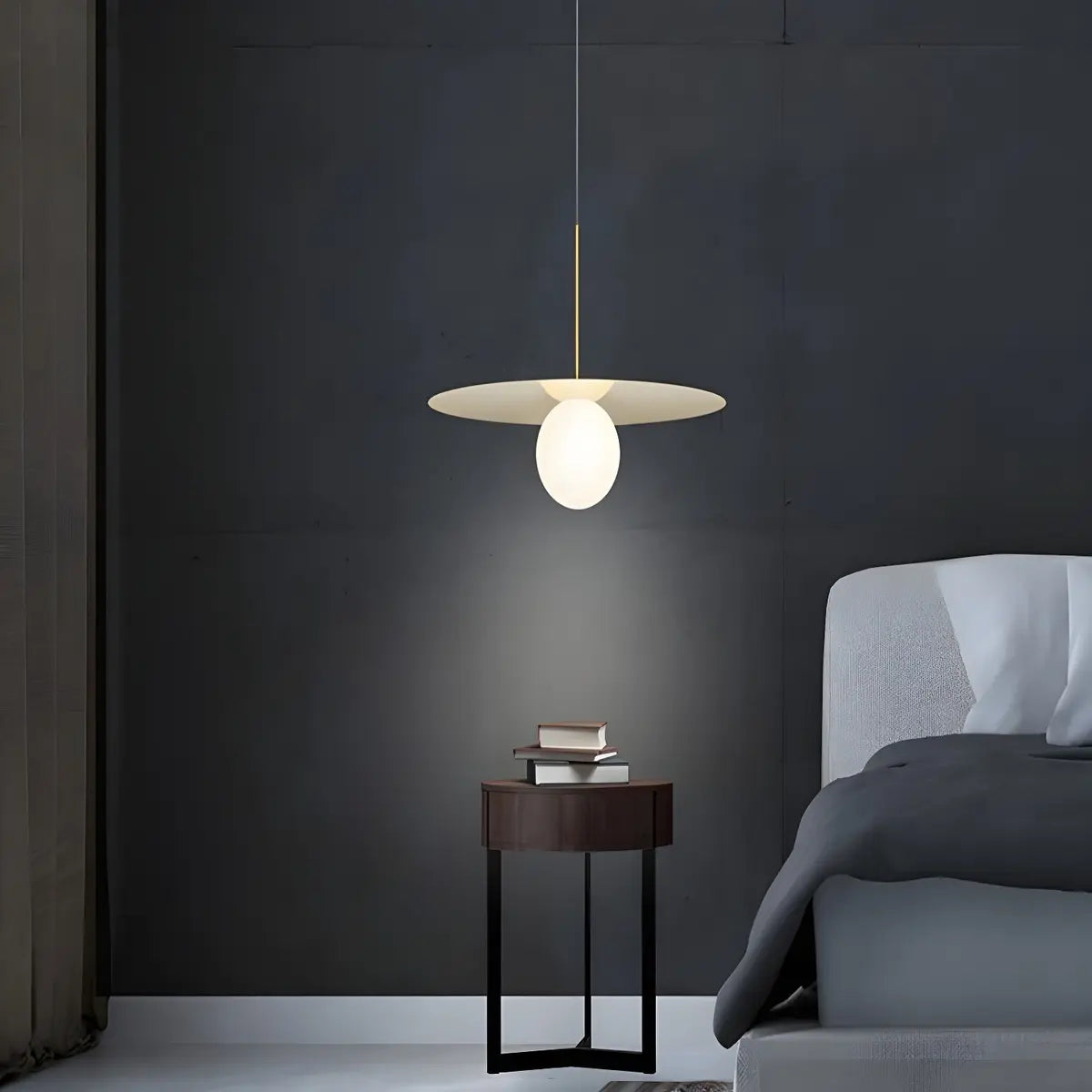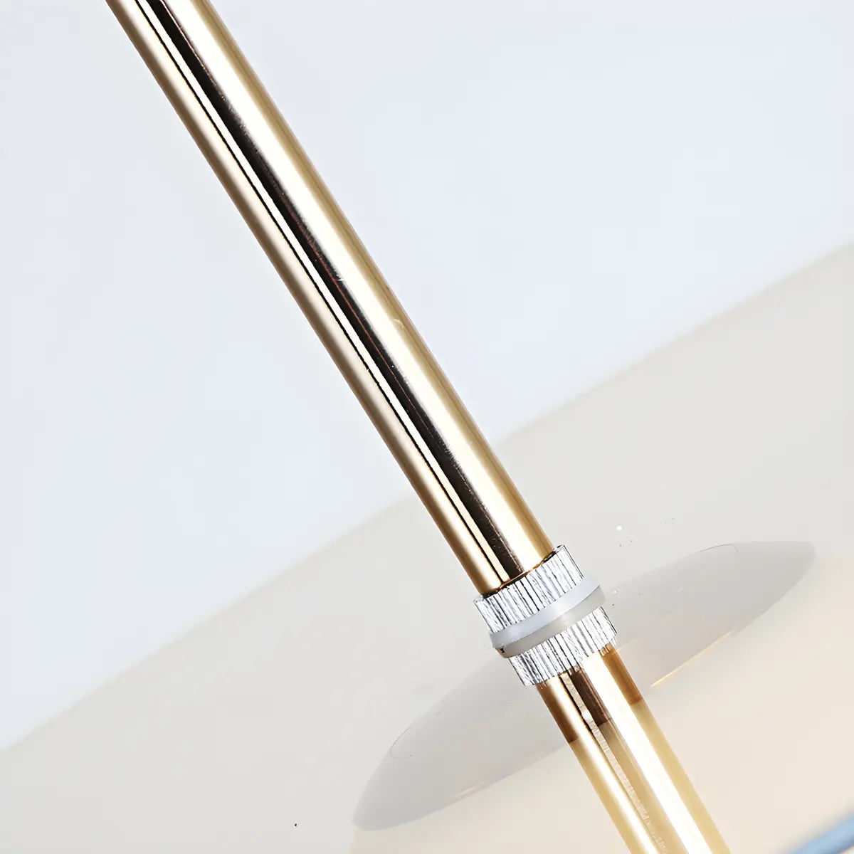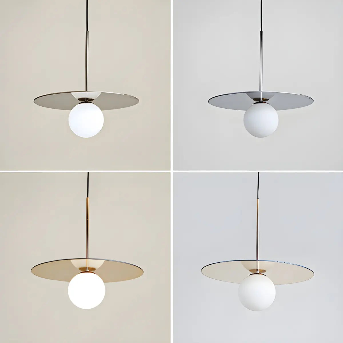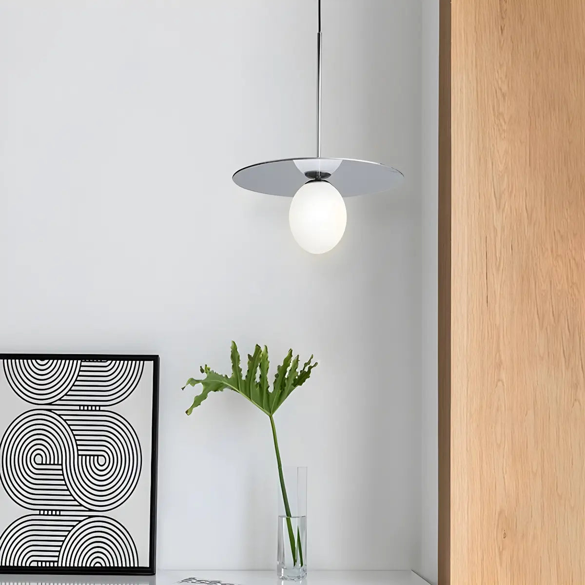 This modern pendant lamp features a simple geometric design, combining an elegant round lampshade with metal details to create a unique visual centerpiece. Its white or amber glass lampshade gives the light a soft and warm atmosphere. It is both a lighting fixture and an interior art piece, perfectly enhancing the aesthetic value of the kitchen.