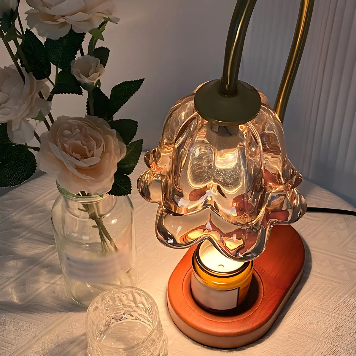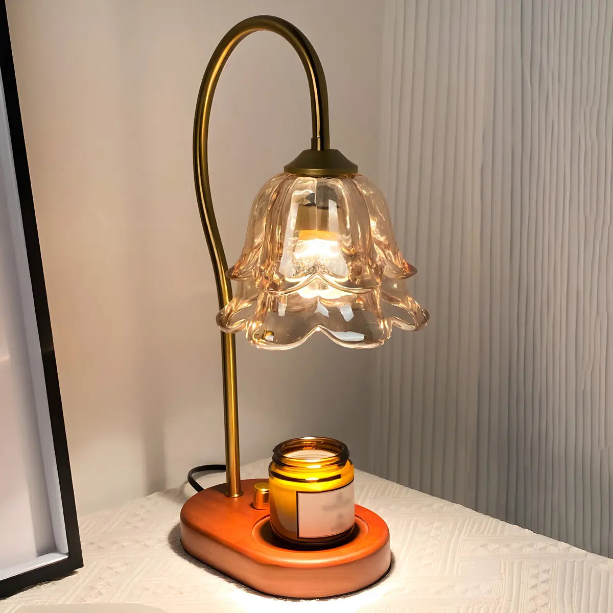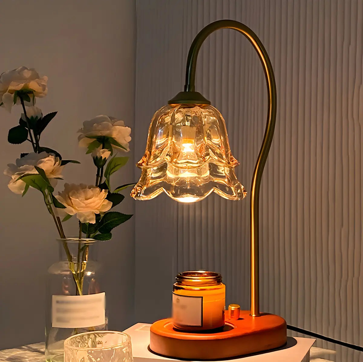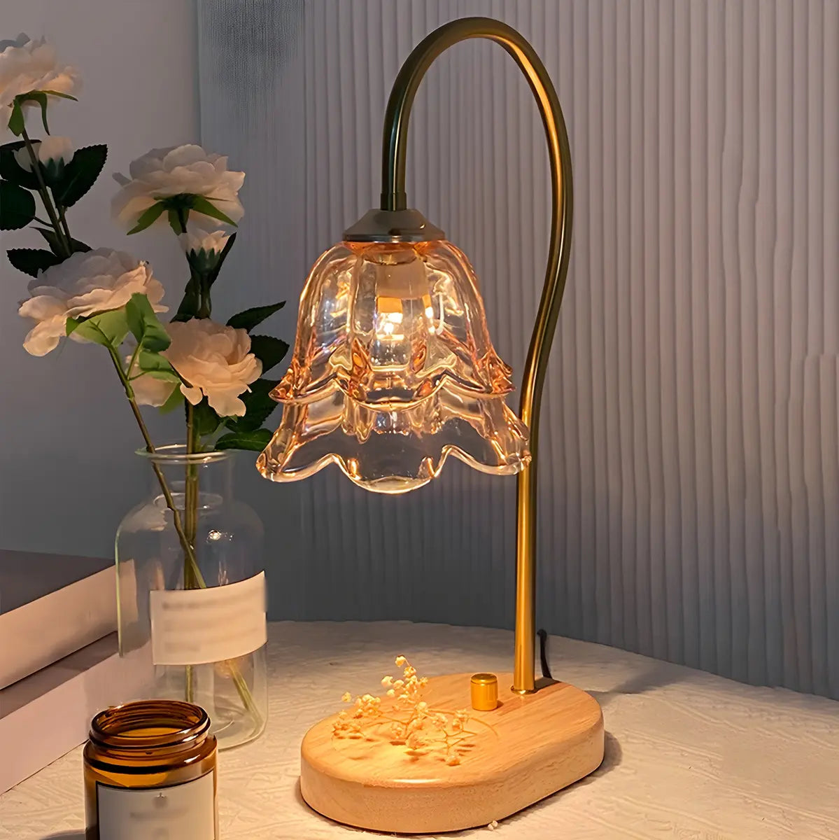 This modern table lamp combines a unique transparent glass flower lampshade with a wooden base, creating an elegant and simple atmosphere, suitable for places such as living rooms and bedrooms.