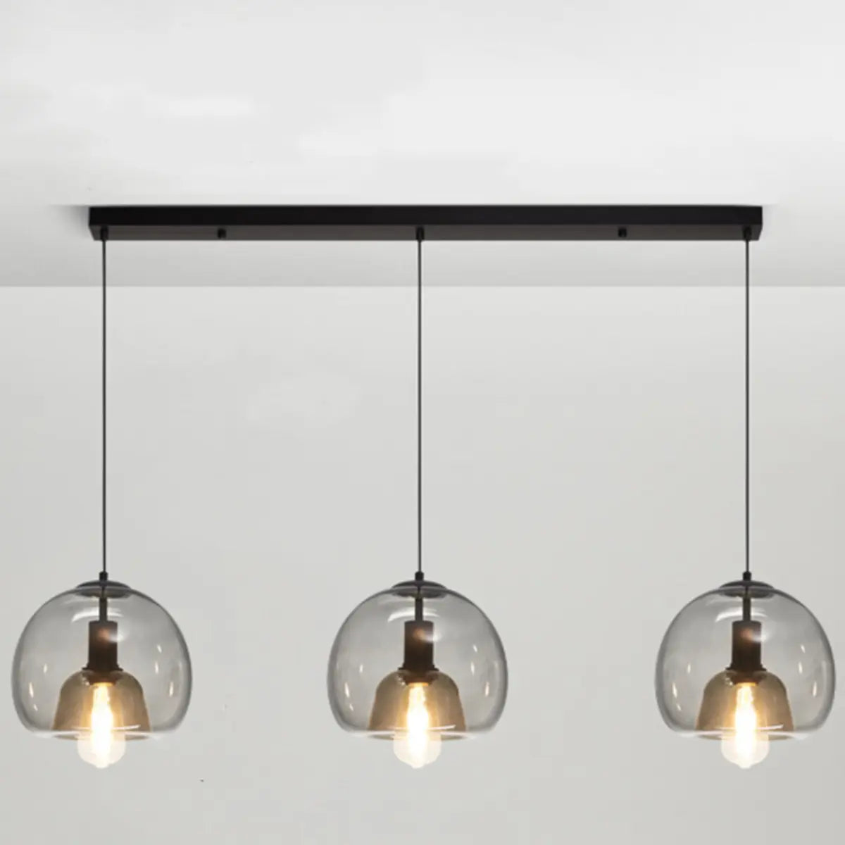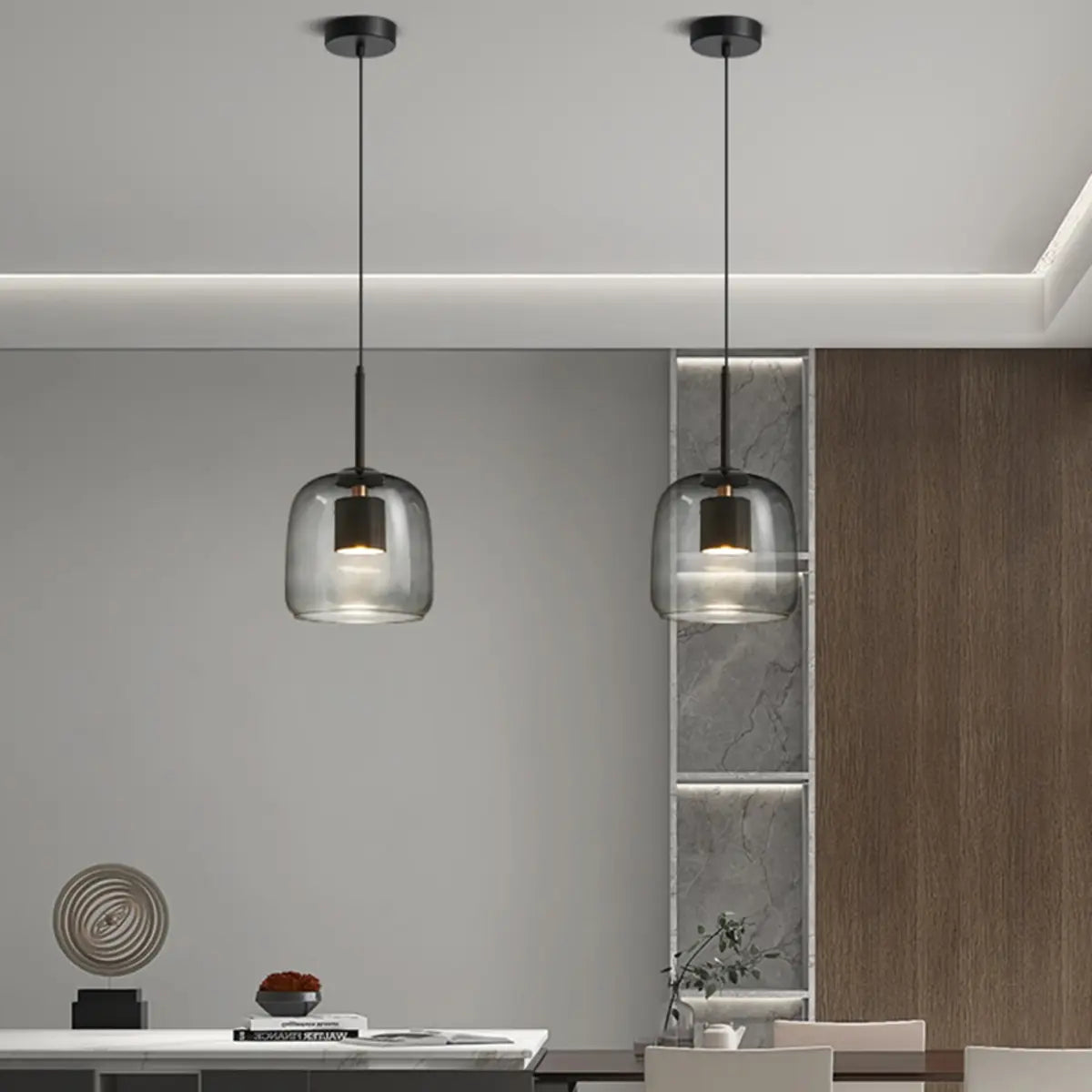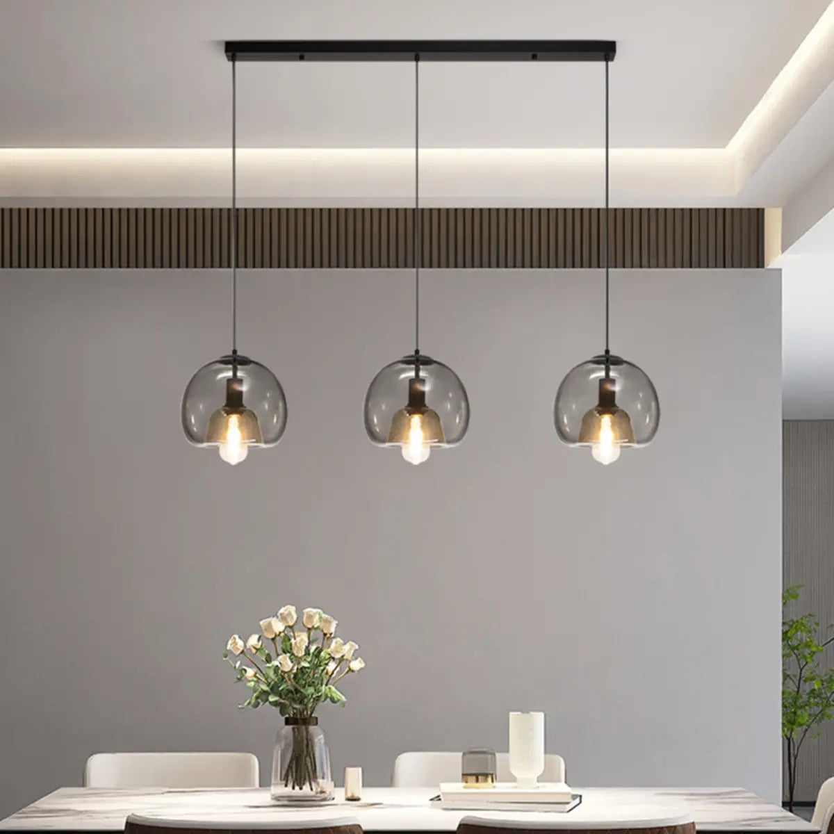 This pendant light displays a minimalist modern style, combining transparent glass with black metal to create an elegant and understated aesthetic. Its rounded dome lampshade not only effectively diffuses the light but also adds a visual layering to the space, giving the kitchen area a sophisticated decorative effect.