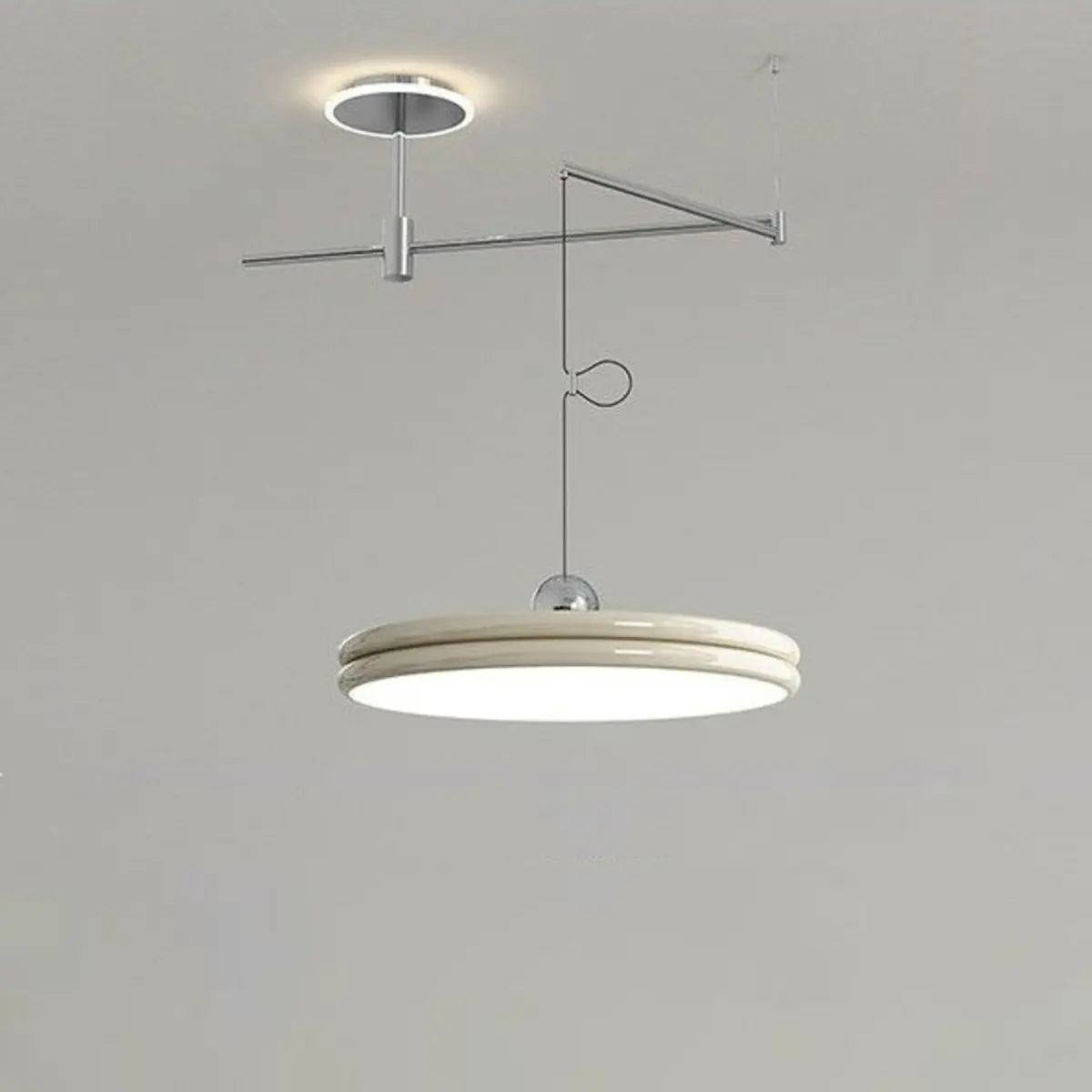 This pendant lamp impresses with its smooth geometric shape and soft cream tones, adding a touch of elegance and warmth to the modern kitchen. The combination of metal and acrylic enhances the overall texture and makes it an artistic highlight in the space, perfectly blending into various interior decoration styles.