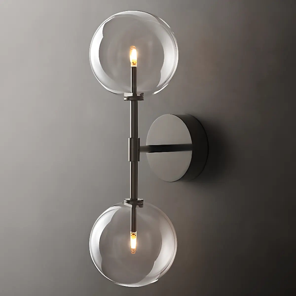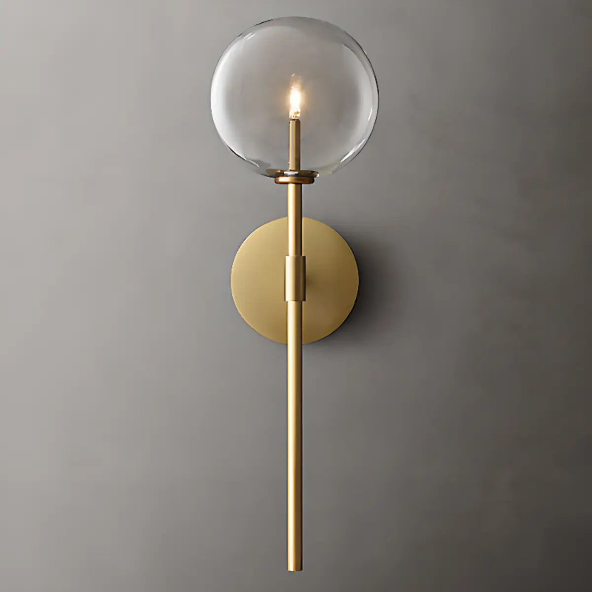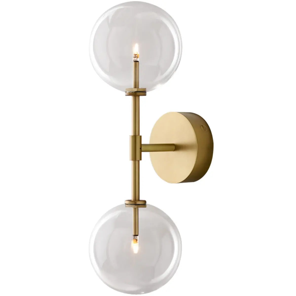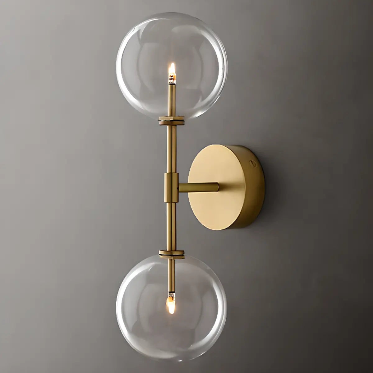This modern wall lamp attracts attention with its exquisite gold metal and double spherical clear glass shade. It is suitable for all interior spaces, whether it is a living room, bedroom or hallway, it can bring an elegant atmosphere to your home.