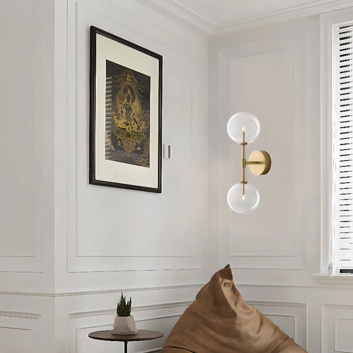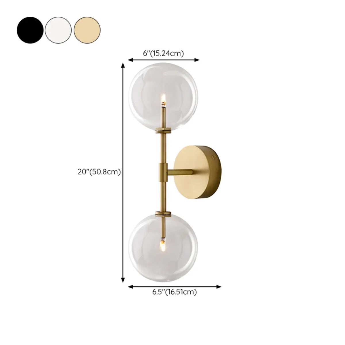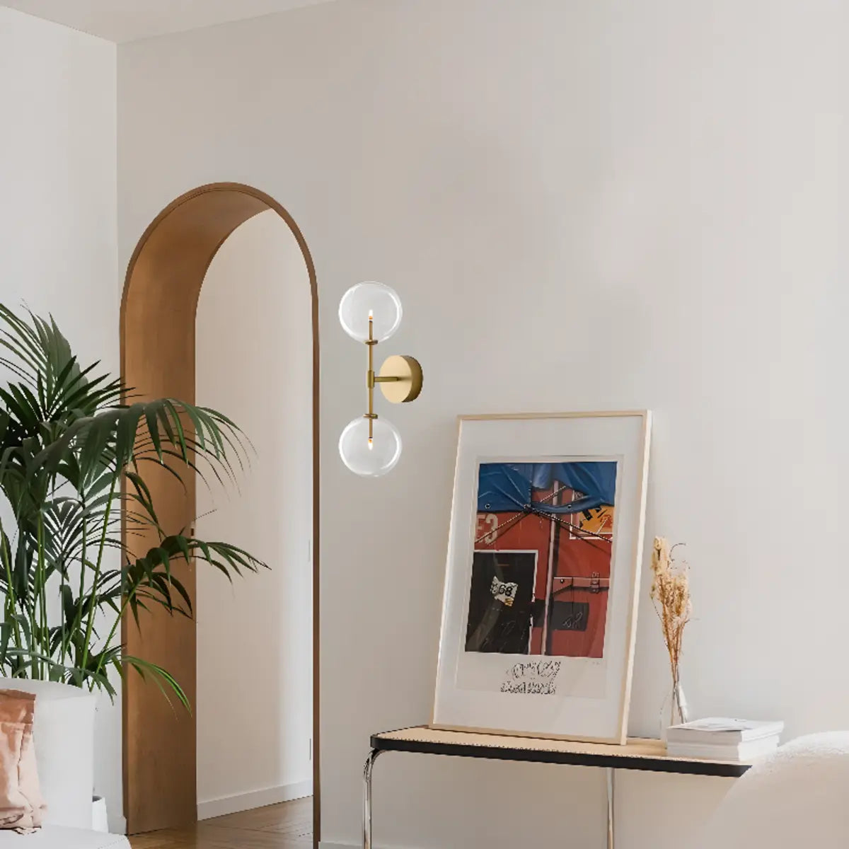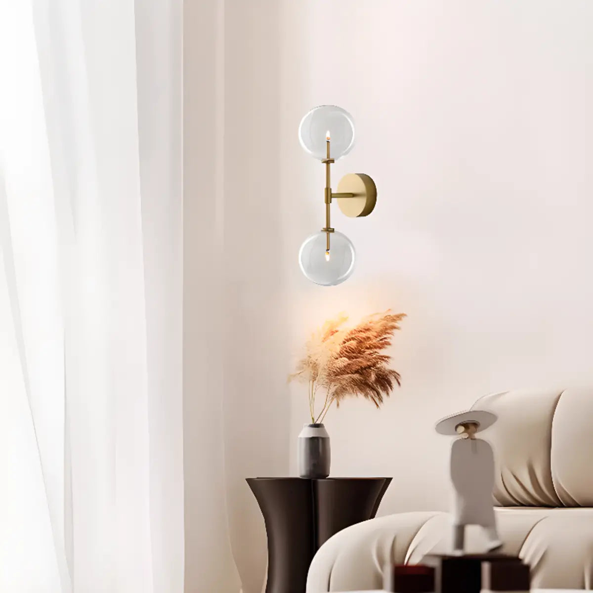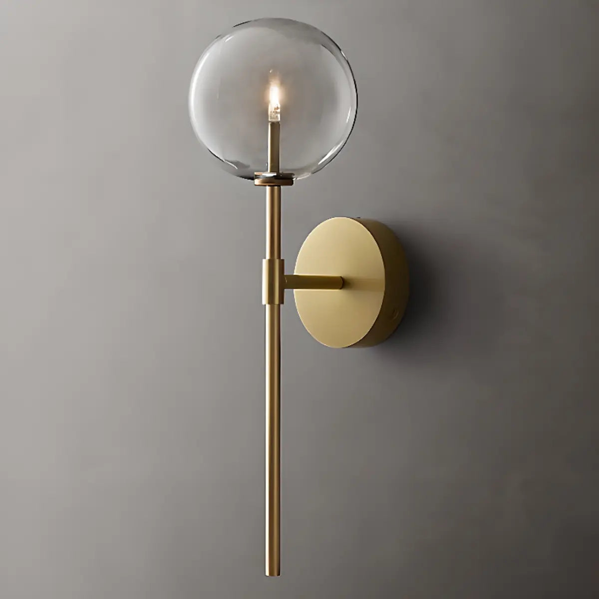 This modern wall lamp attracts attention with its exquisite gold metal and double spherical clear glass shade. It is suitable for all interior spaces, whether it is a living room, bedroom or hallway, it can bring an elegant atmosphere to your home.