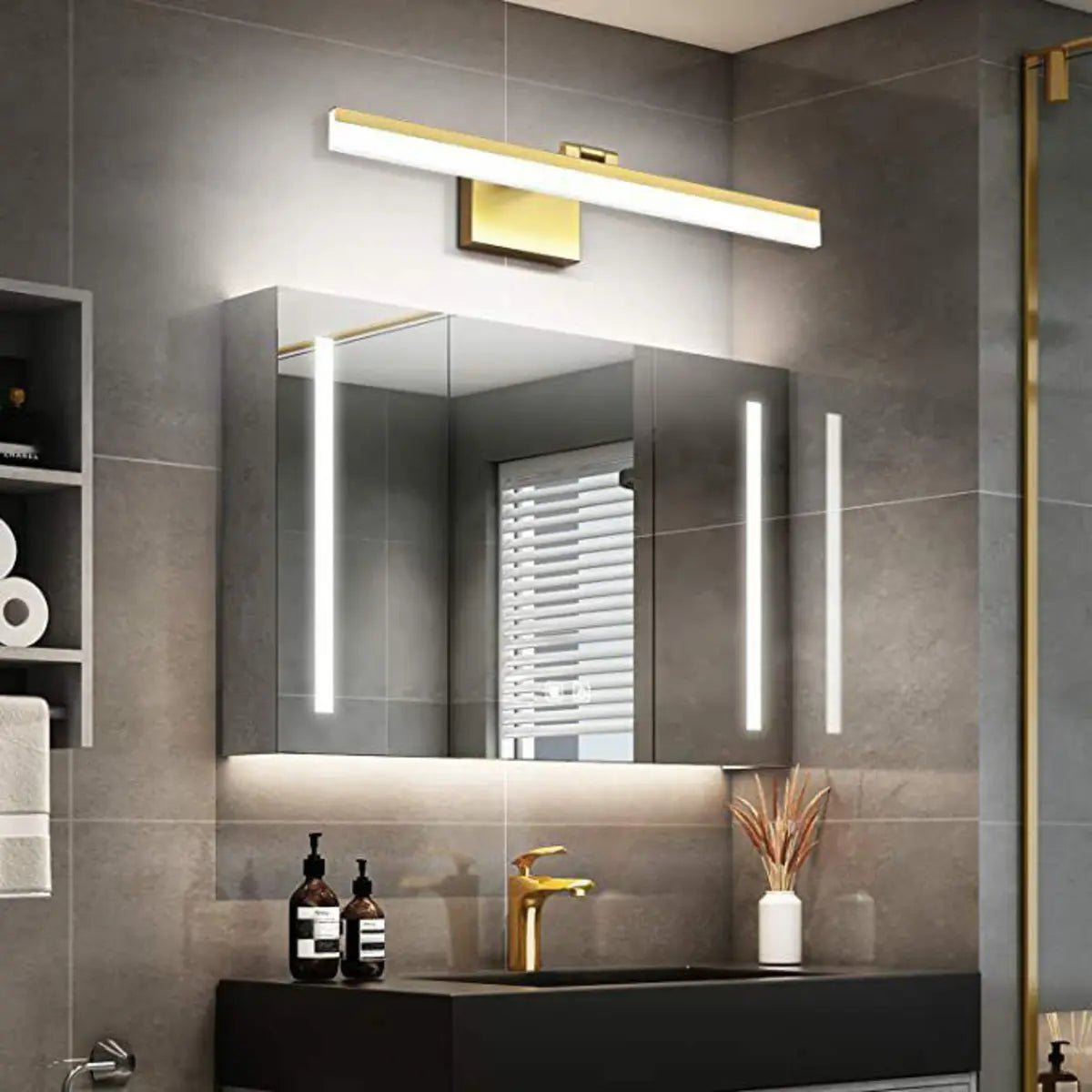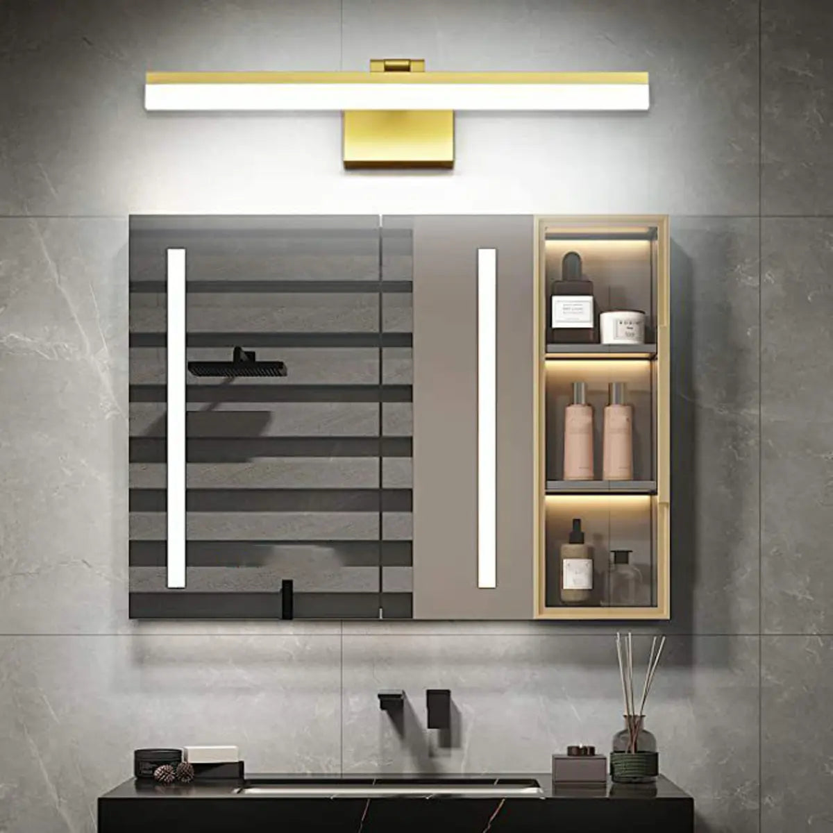 This modern LED bathroom light fixture adds a touch of upscale elegance to your home with its sleek rectangular design and sophisticated gold finish. Whether used in front of a bathroom mirror or above a vanity, this light emits ample and even lighting.
