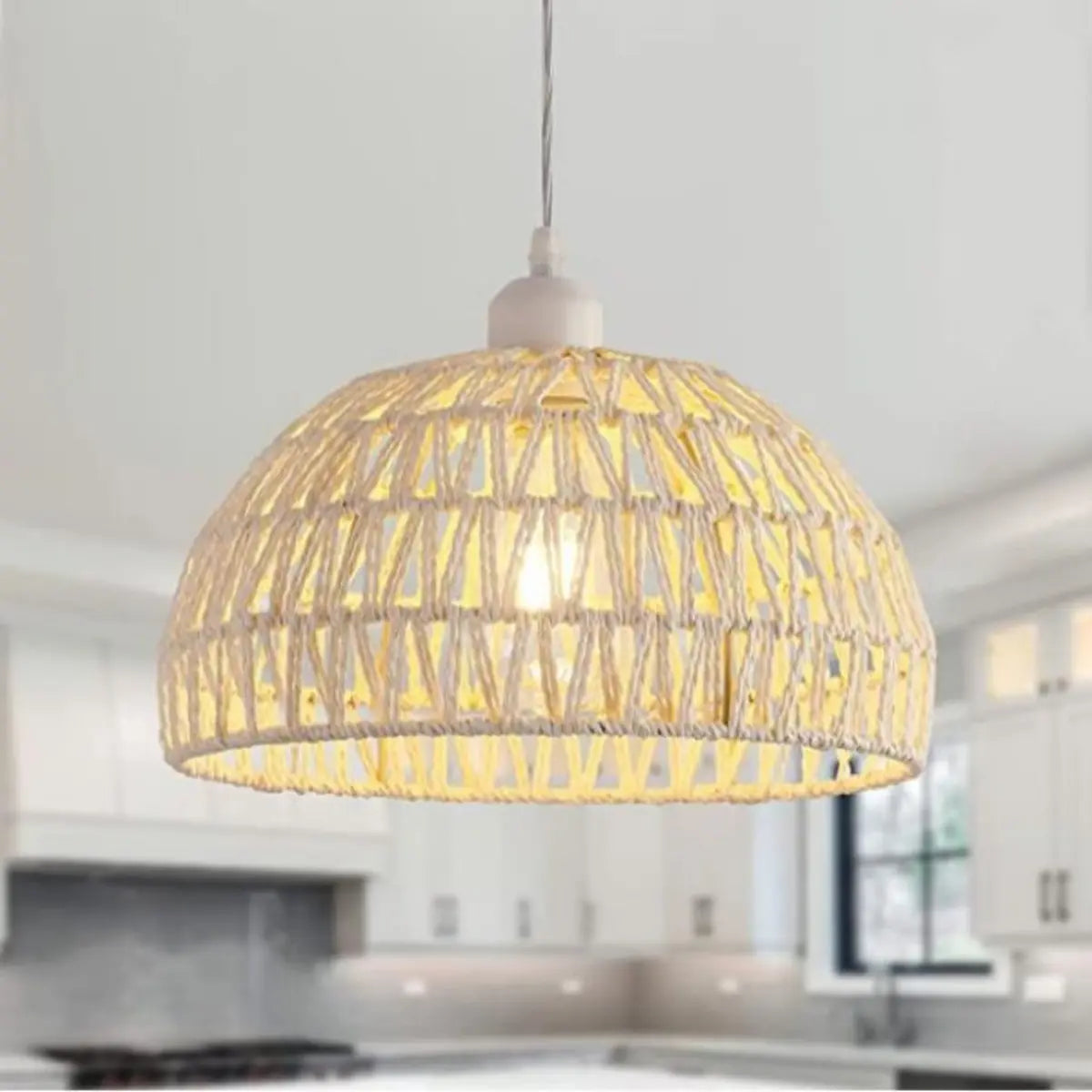 This contemporary pendant light adds a natural touch to any room with its woven rope dome shade, and its subtle white and linen design lends a unique, artistic touch to any corner. Above the kitchen island, it doubles as both a functional lighting fixture and a beautiful decorative piece.