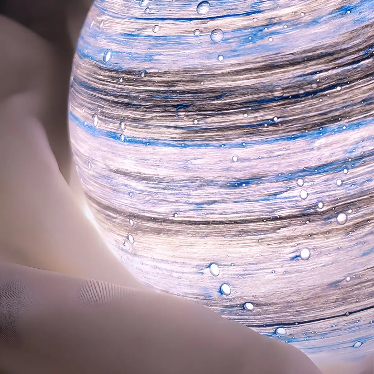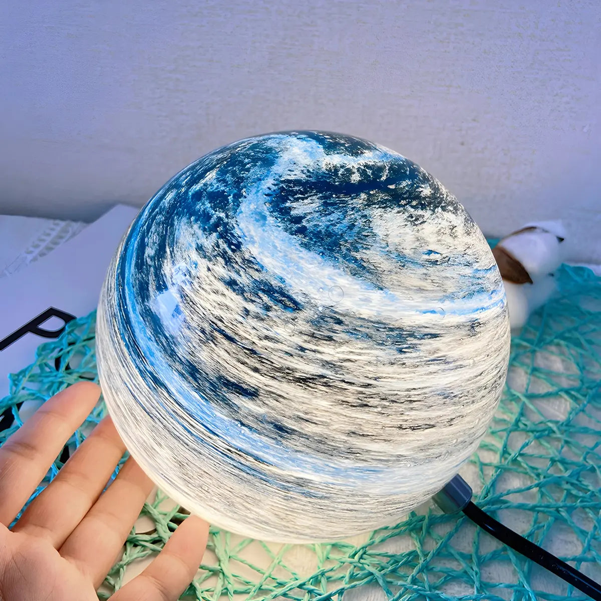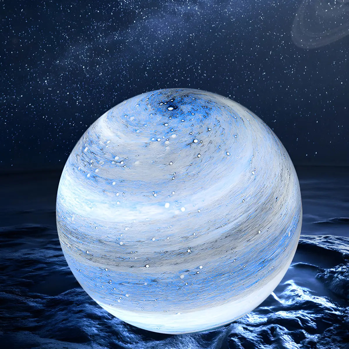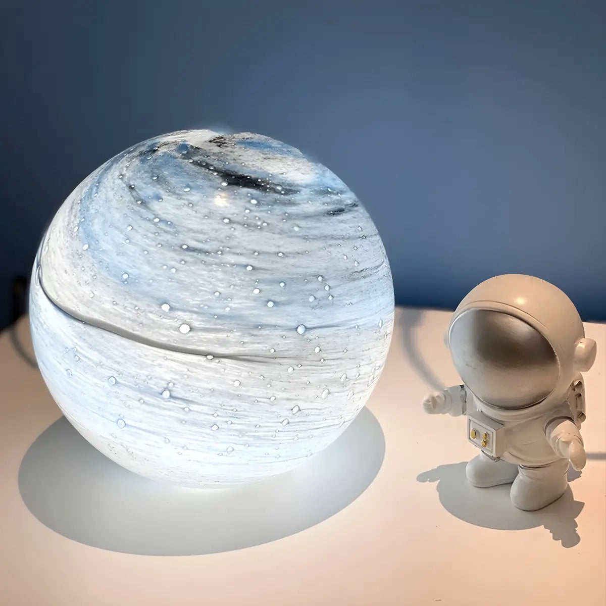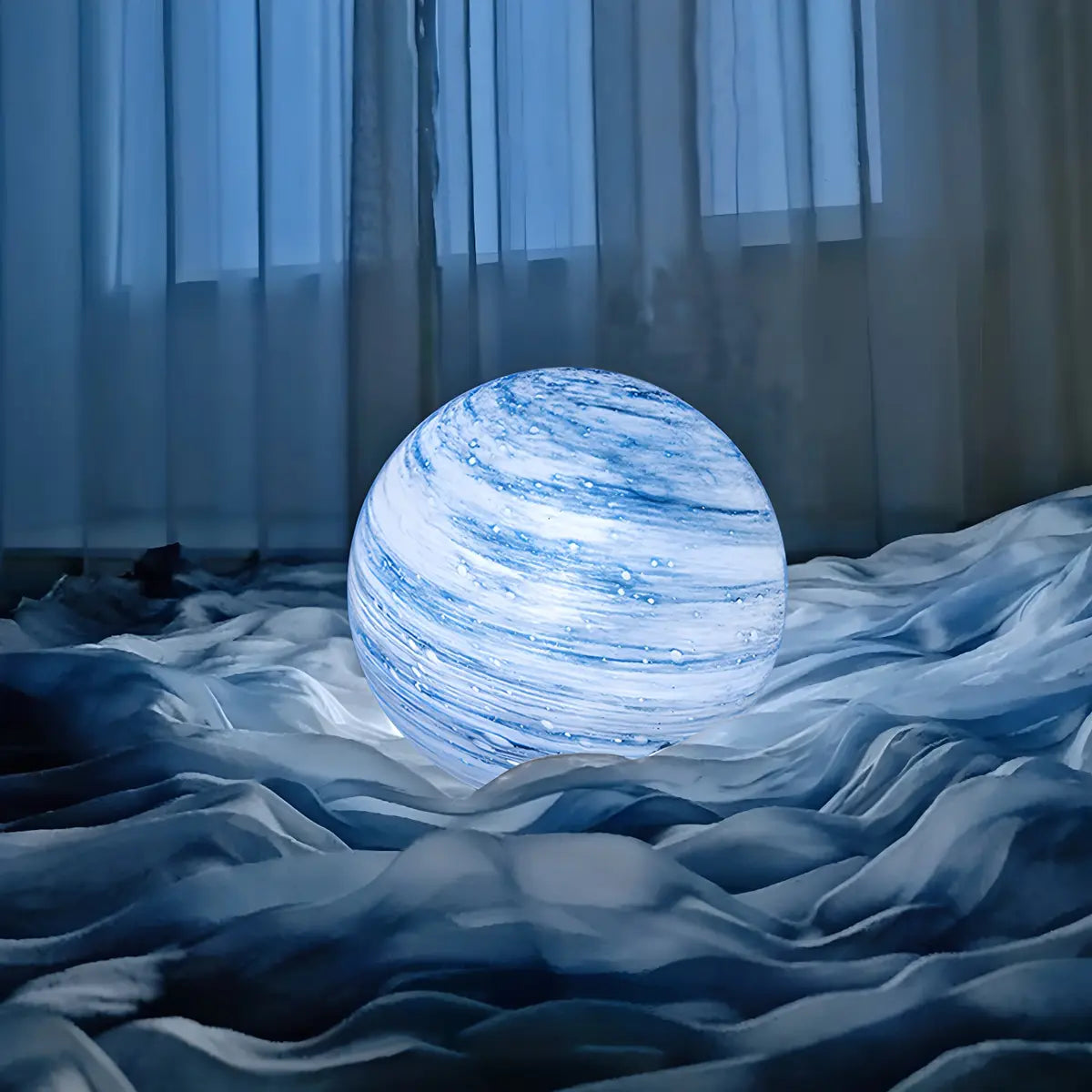 This lamp attracts the eye with its unique spherical glass lampshade. Its surface is as mottled and dreamy as the moon, creating a deep and mysterious visual effect. Whether it is placed in the bedroom or the living room, it can instantly enhance the artistic atmosphere of the space.