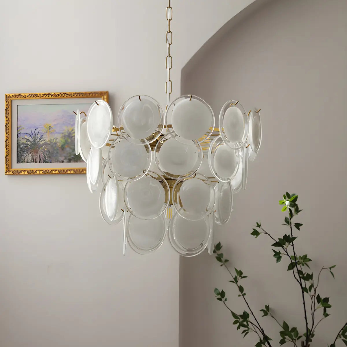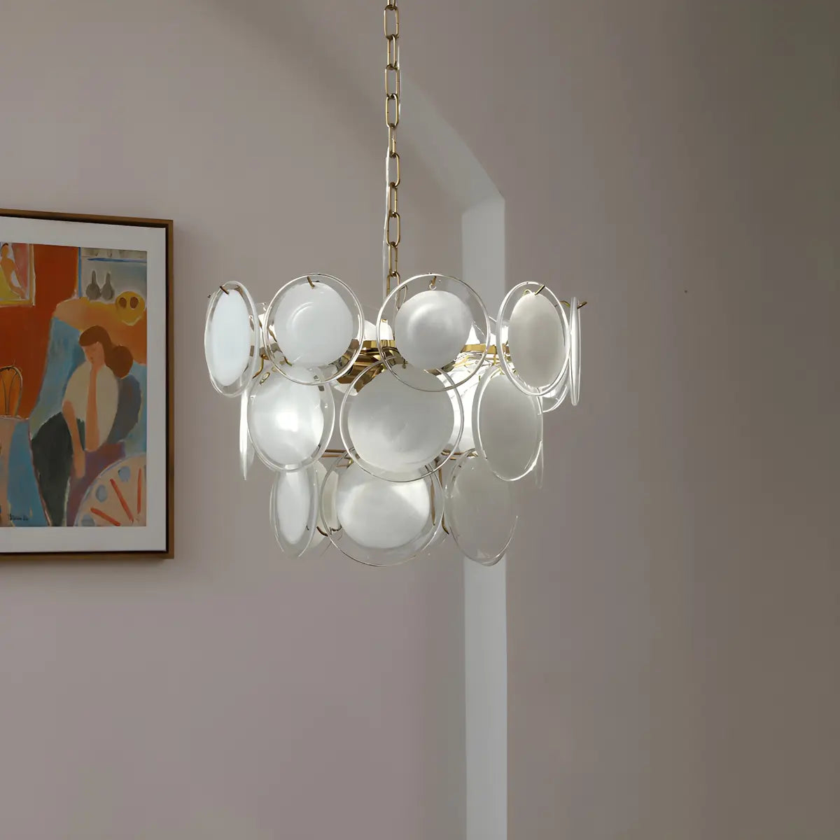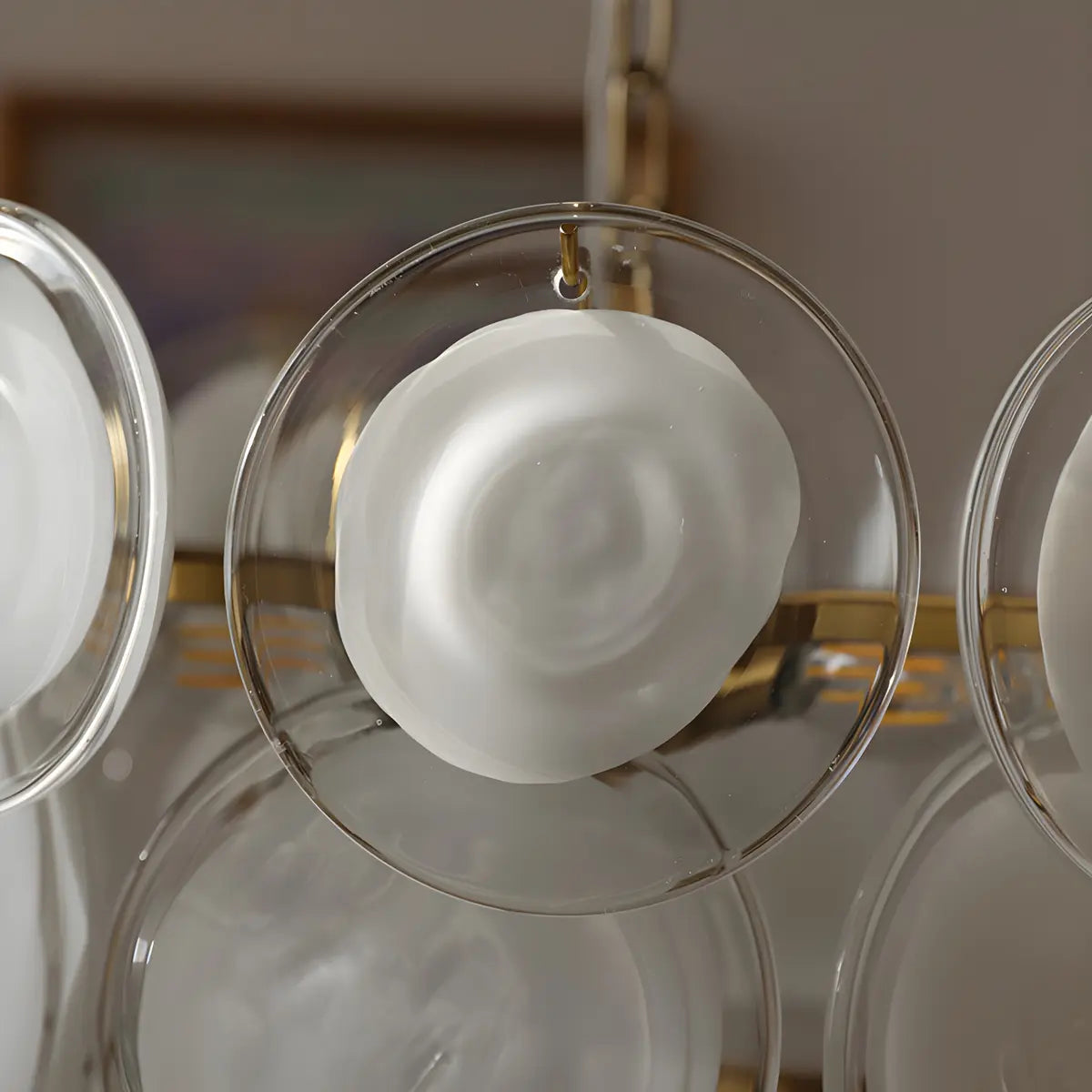 This modern and stylish chandelier features a unique trackball design made up of multiple white translucent glass discs overlapping vertically, presenting a dynamic visual effect.