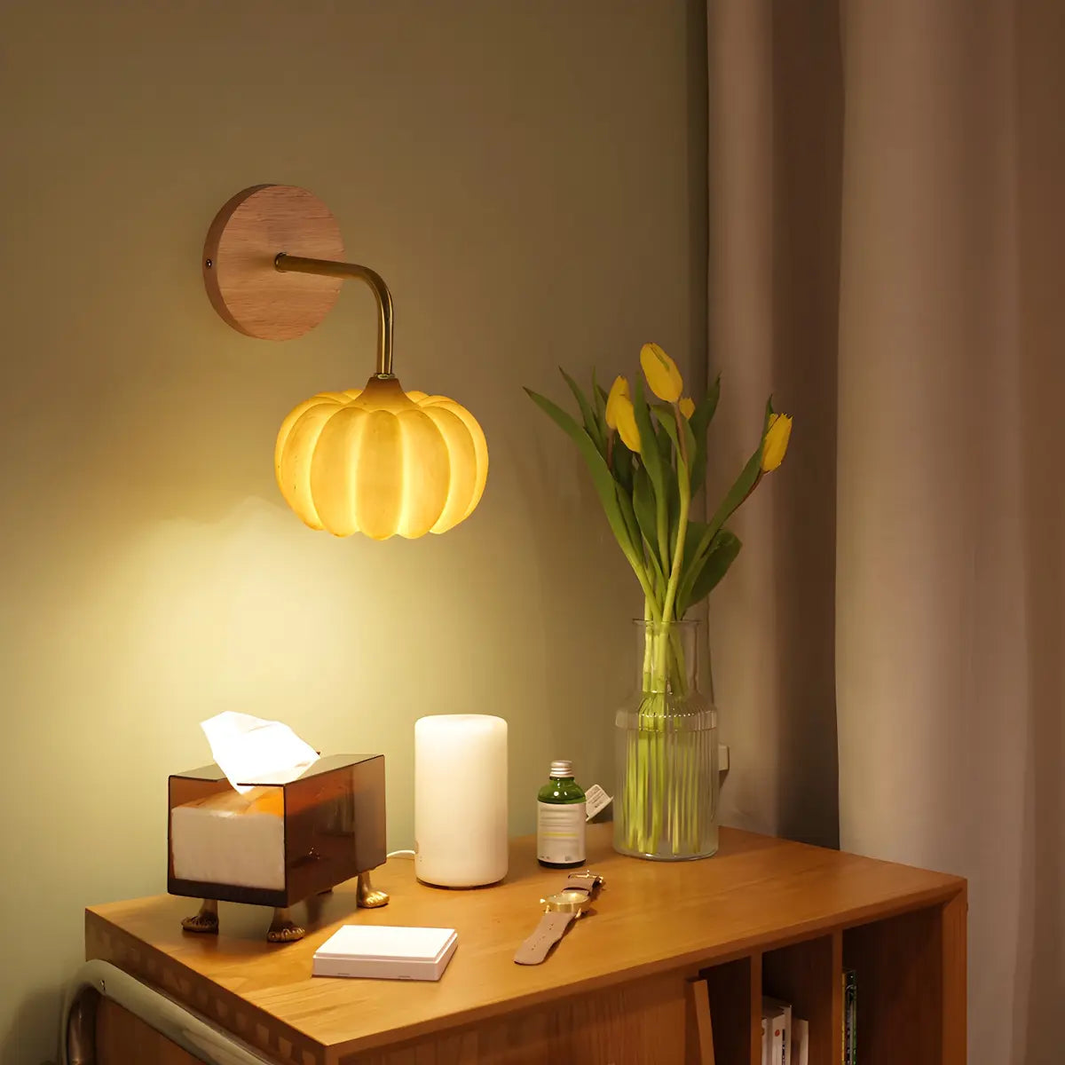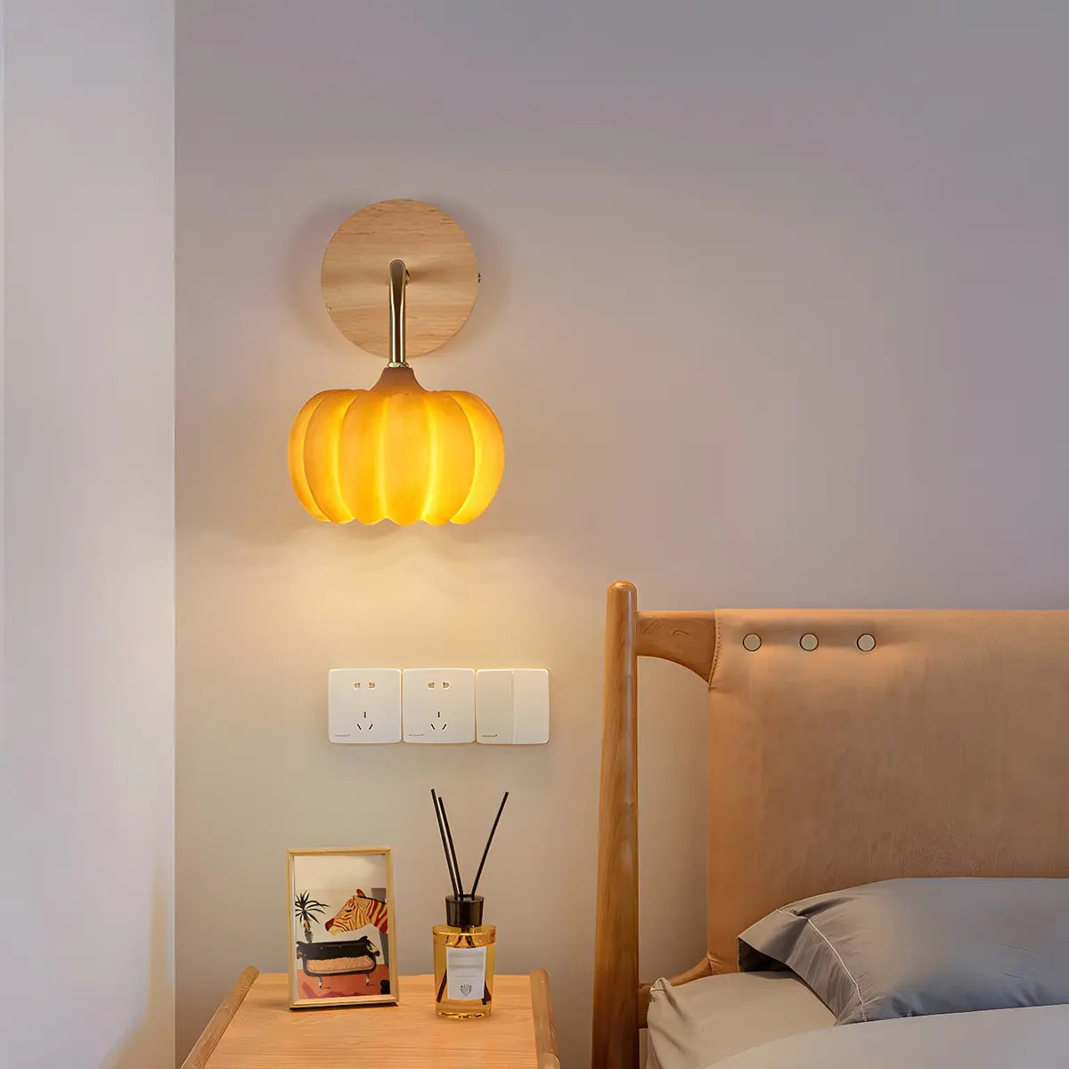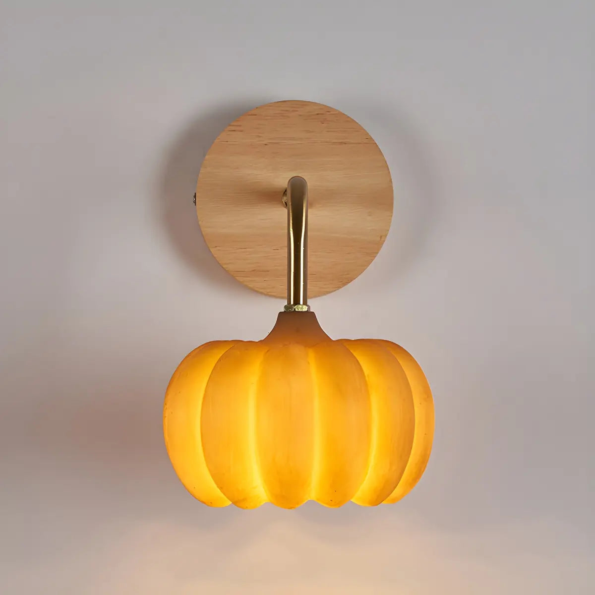 This modern wall lamp features a unique pumpkin shape, with an orange resin lampshade combined with a high-quality wooden base, adding a warm and lively indoor atmosphere.