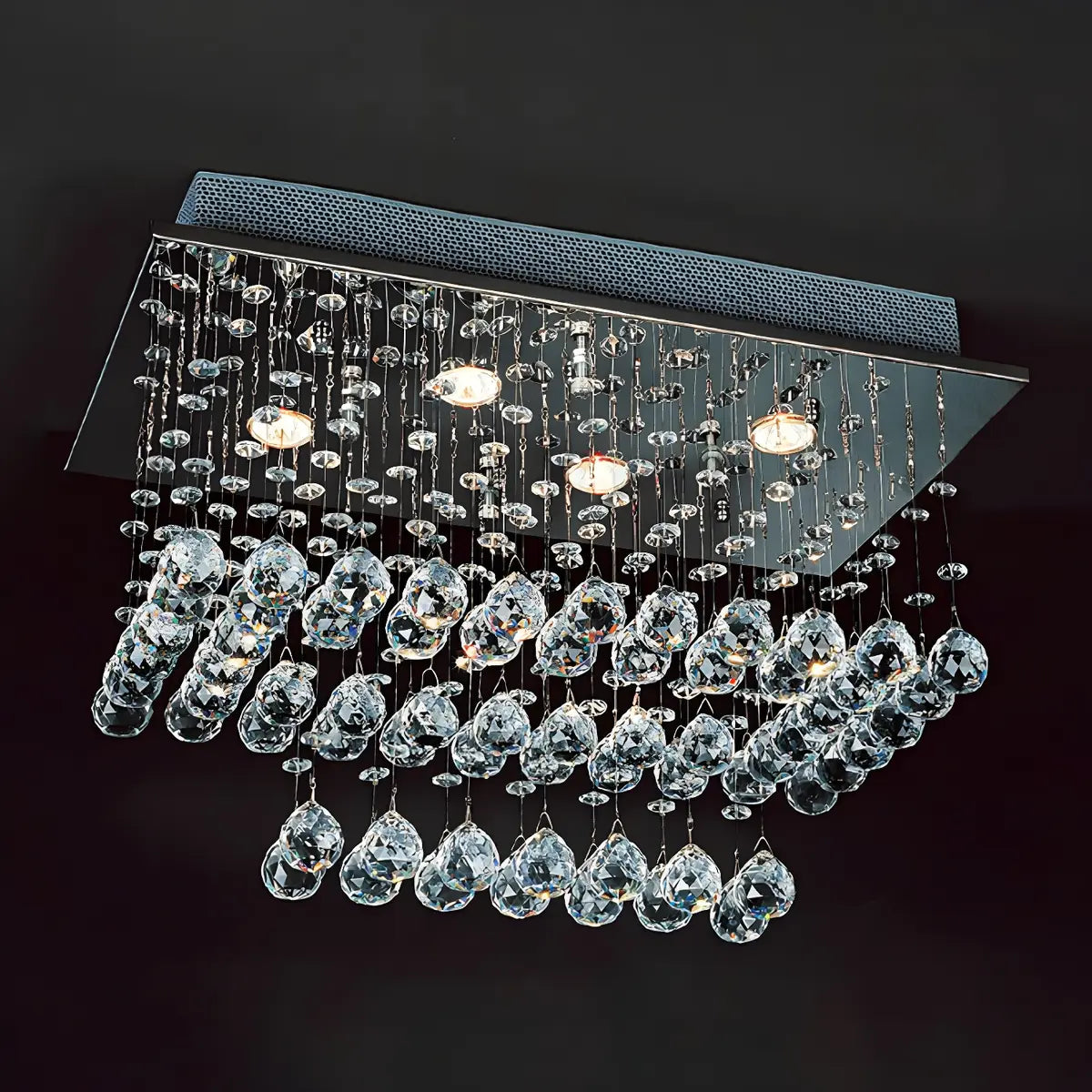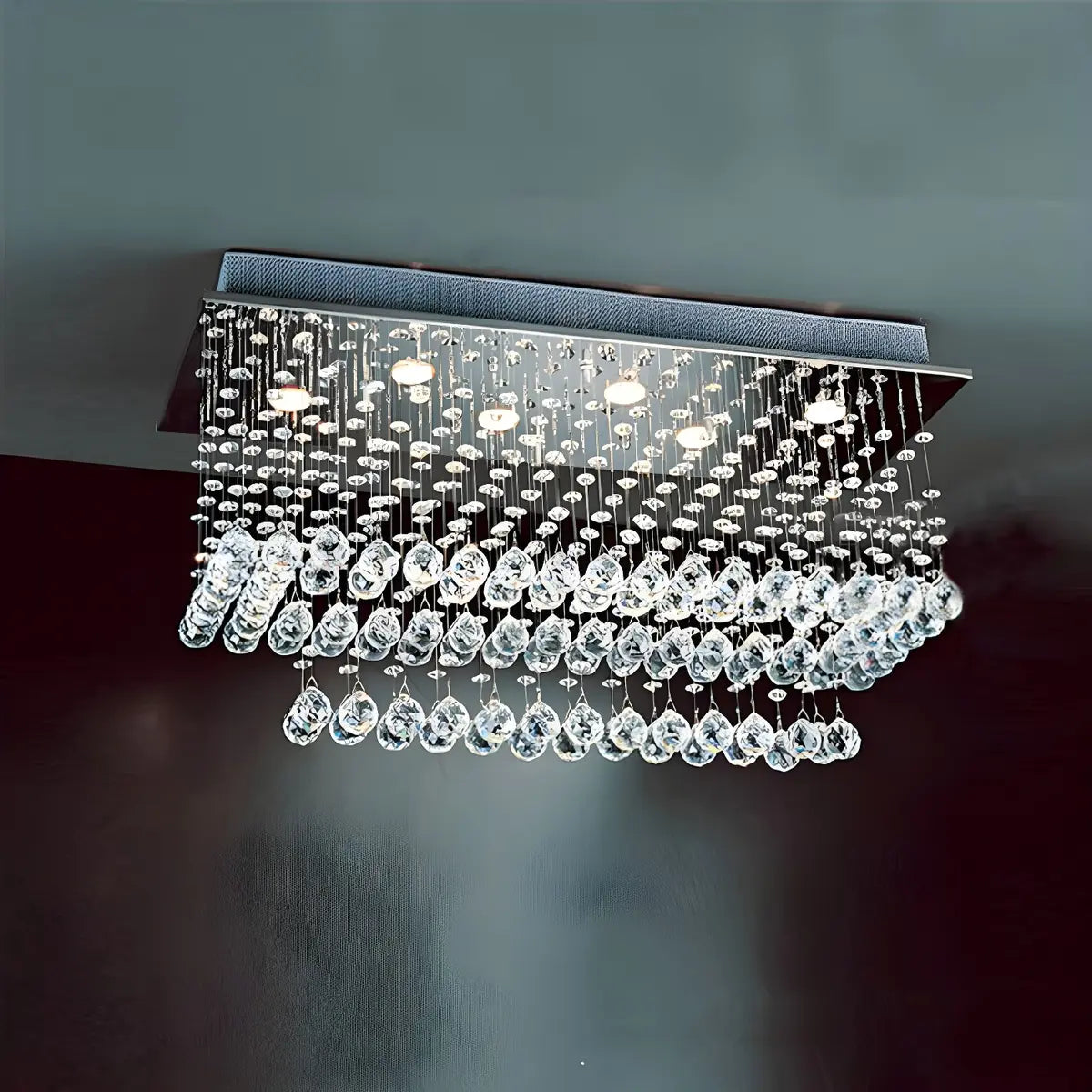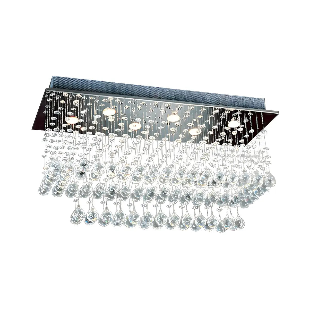 This modern crystal semi-recessed ceiling lamp, with its dazzling design, looks like a crystal meteor hanging in the air, and its brilliant light reflects countless dreamy spots, adding a touch of nobility and elegance to the room. Its crystal components are delicately inlaid on the nickel-colored frame, and the streamlined draping design is like a falling bead curtain, combining modern aesthetics with luxury.