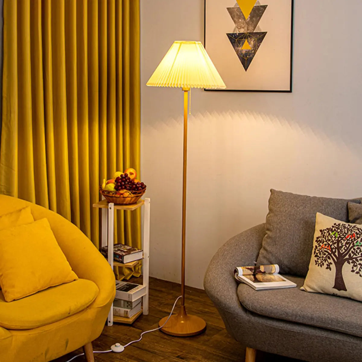 Featuring a classic yellow body and pleated fabric shade, this modern metal standing lamp is the perfect combination of traditional and contemporary design.
