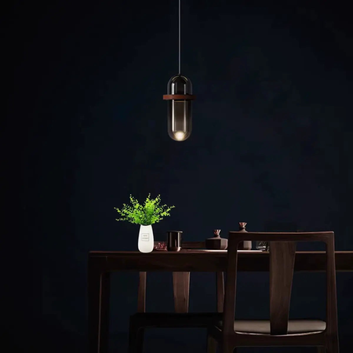 This pendant lamp features a capsule-shaped grey glass lampshade, a perfect combination of modern style and exquisite design, giving the space a stylish and artistic feel. Its soft light exudes a hazy beauty within the lampshade, adding a unique decorative effect to the kitchen and island.