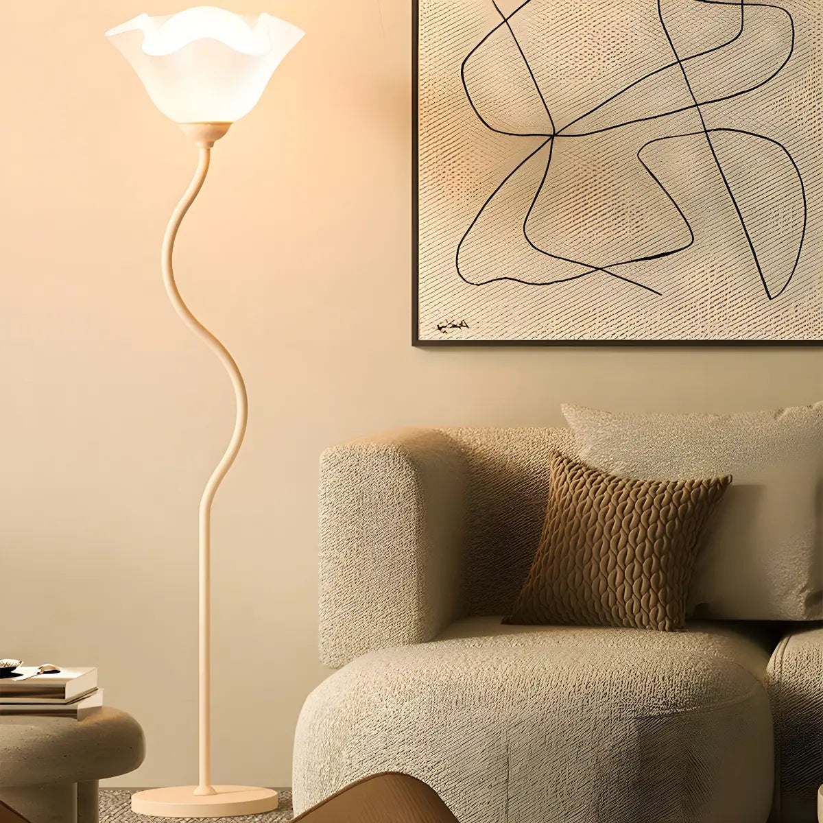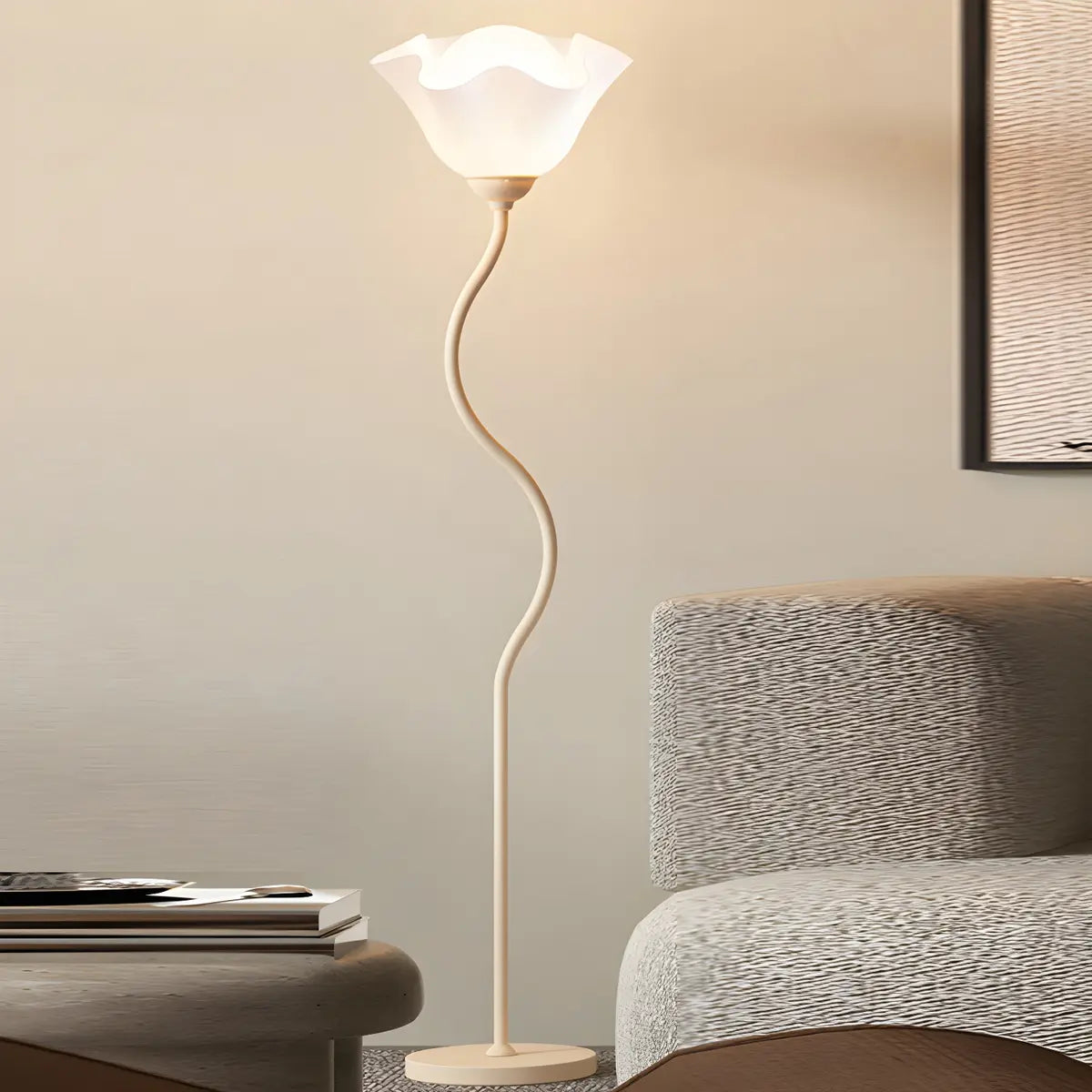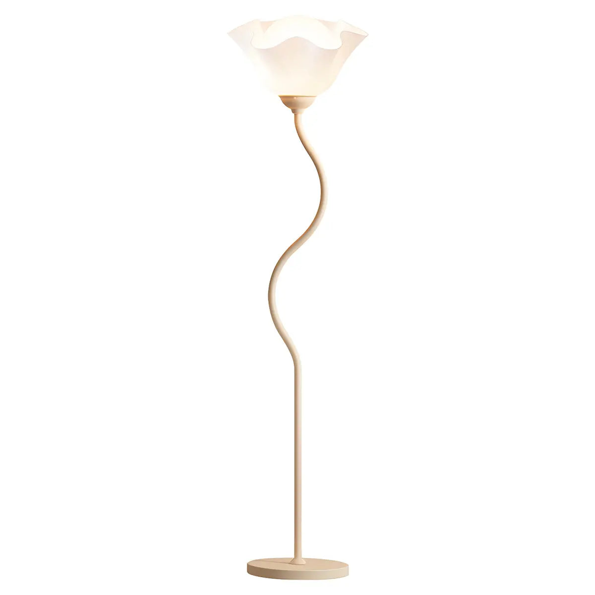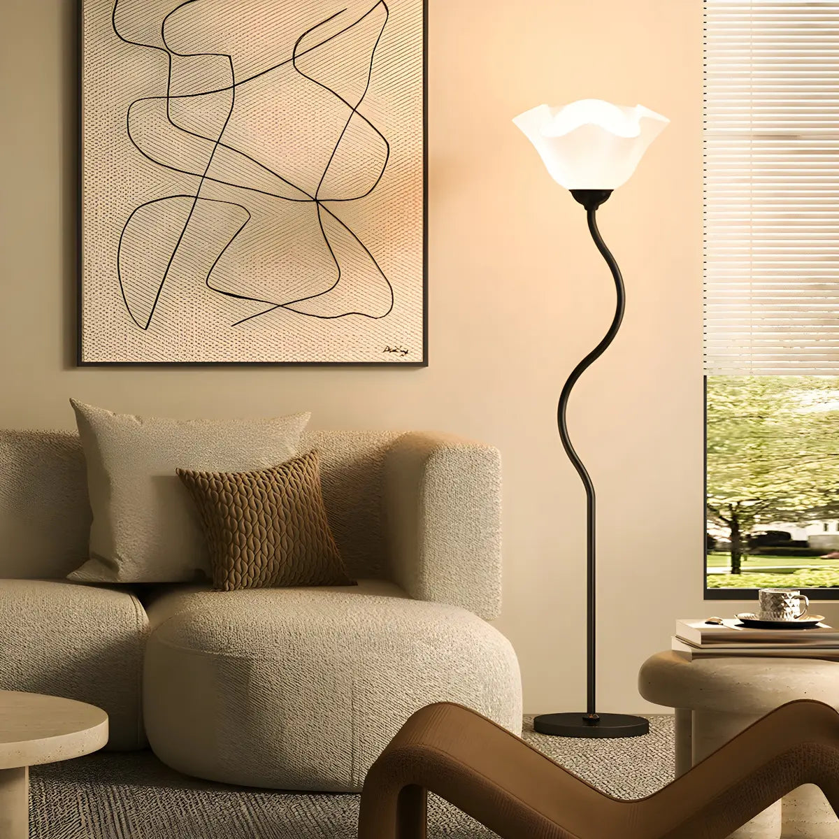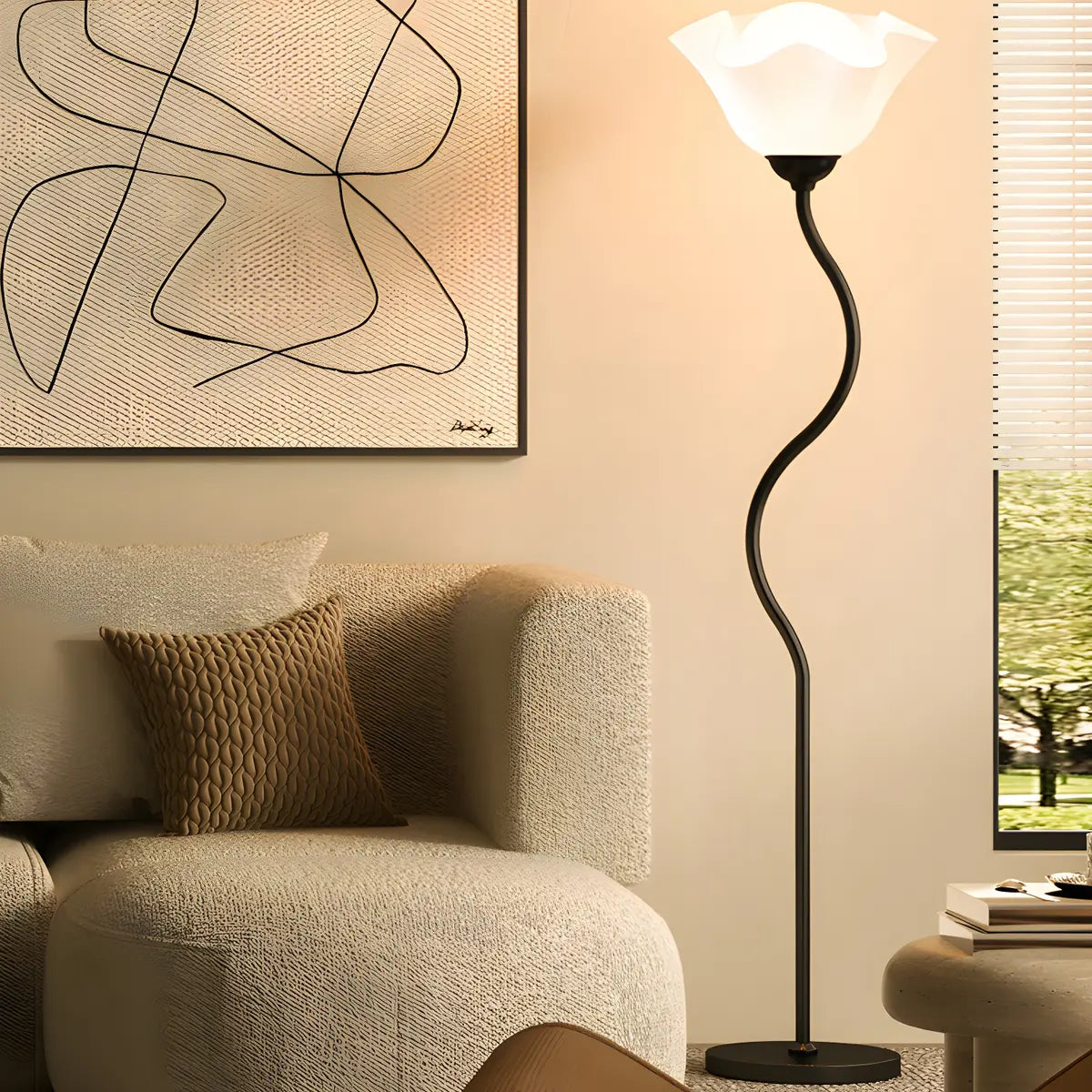 This elegant floor lamp with a modern curved metal stem will add a touch of style to your home. Its graceful curves and petal-shaped lampshade combine classic and modern styles for a decorative touch.