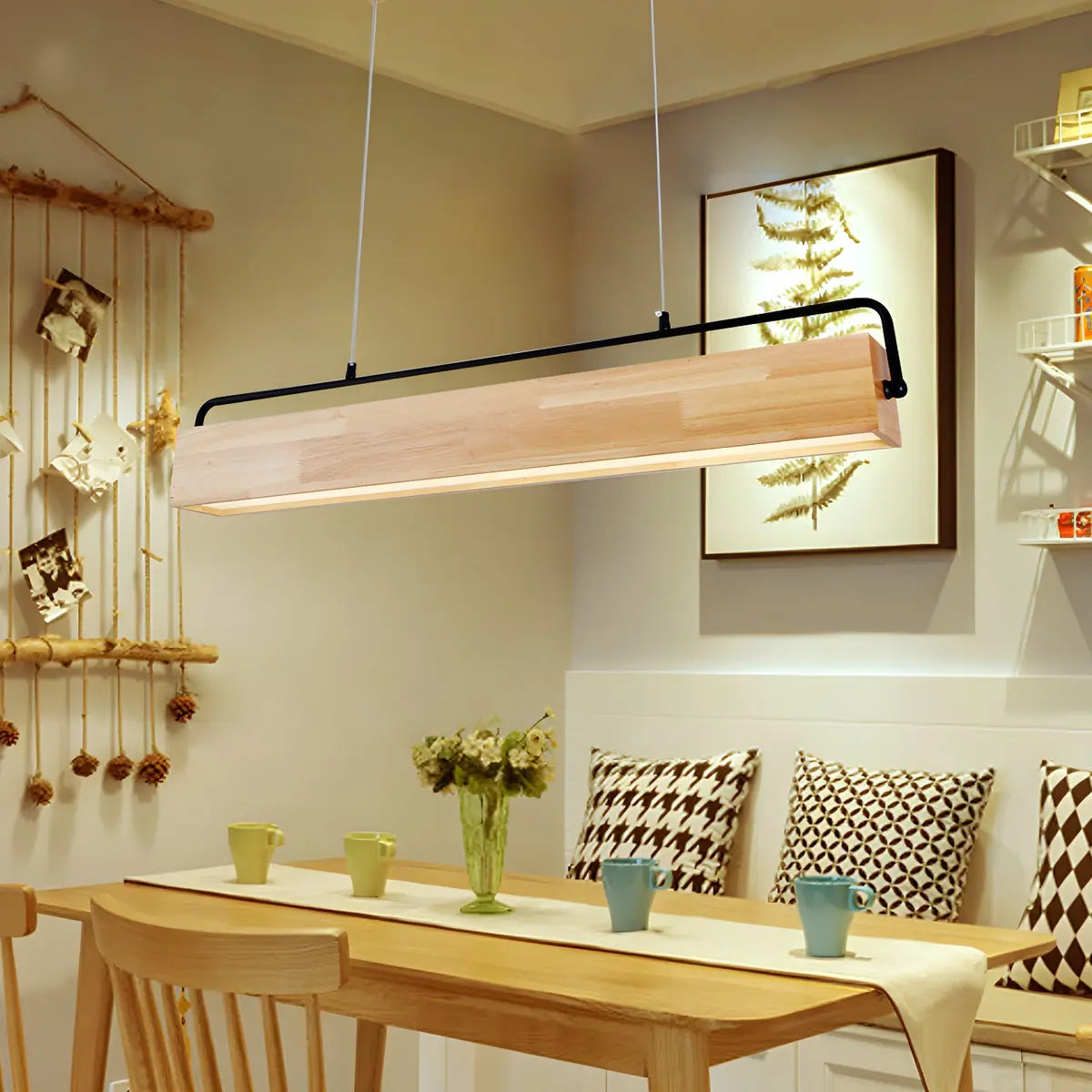 This modern wooden linear pendant light adds a simple and elegant touch to your kitchen island or dining area with its elegant rectangular design. Perfect for everyday use or special occasions.