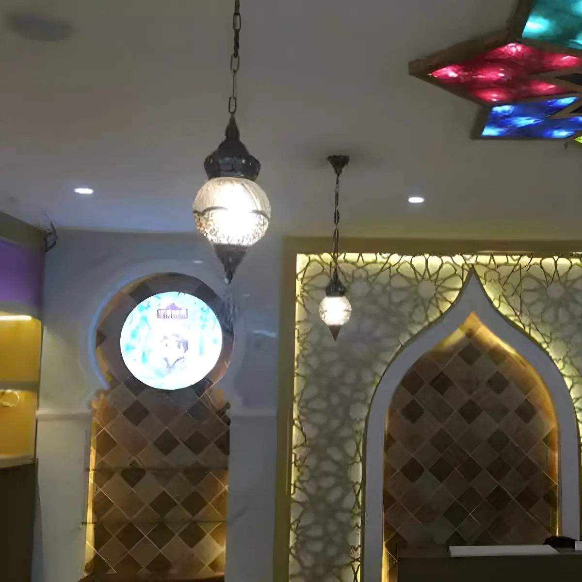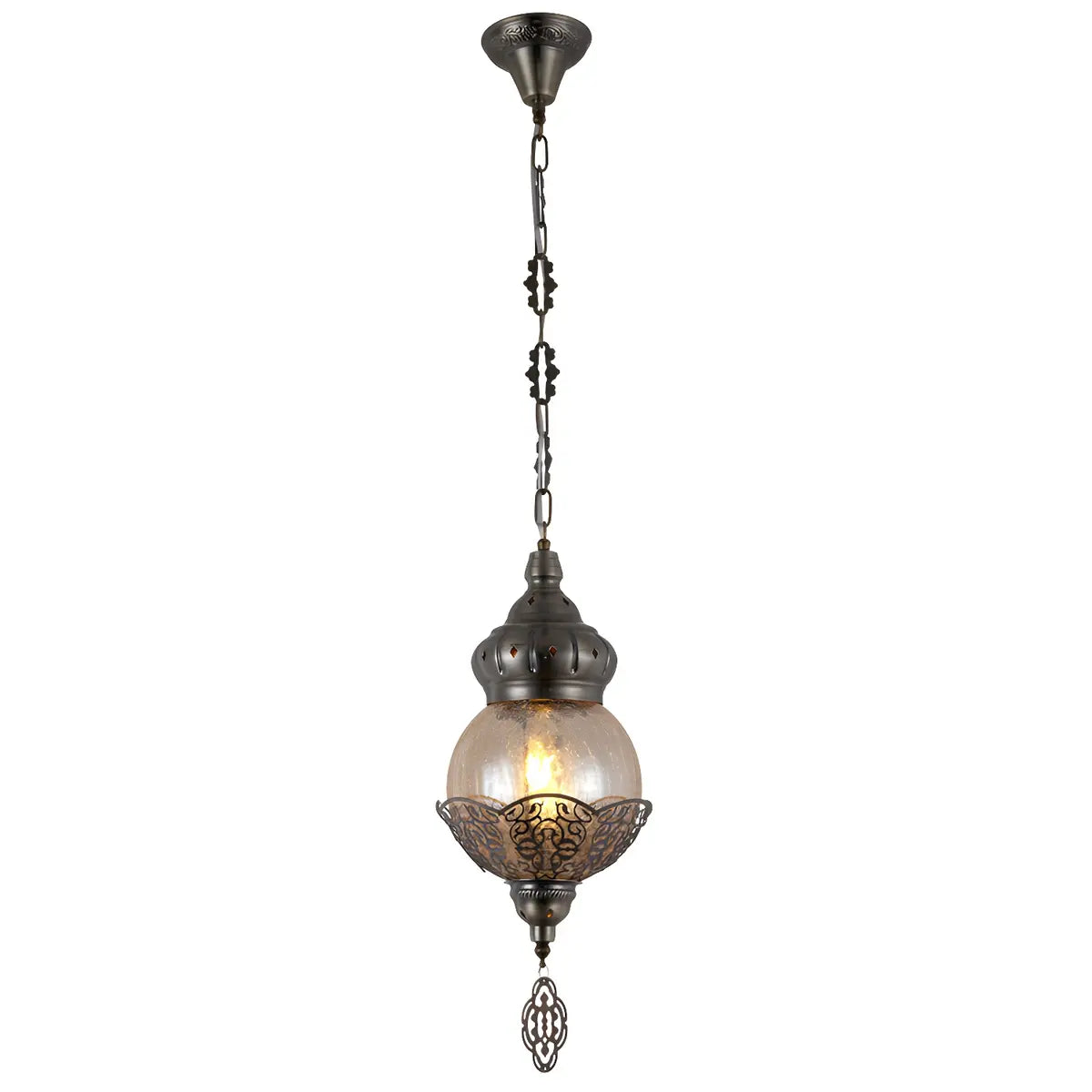 This unique Moroccan pendant light features a beautiful metal cutout and cracked glass shade. This exquisite lamp will add a strong exotic touch to your home.