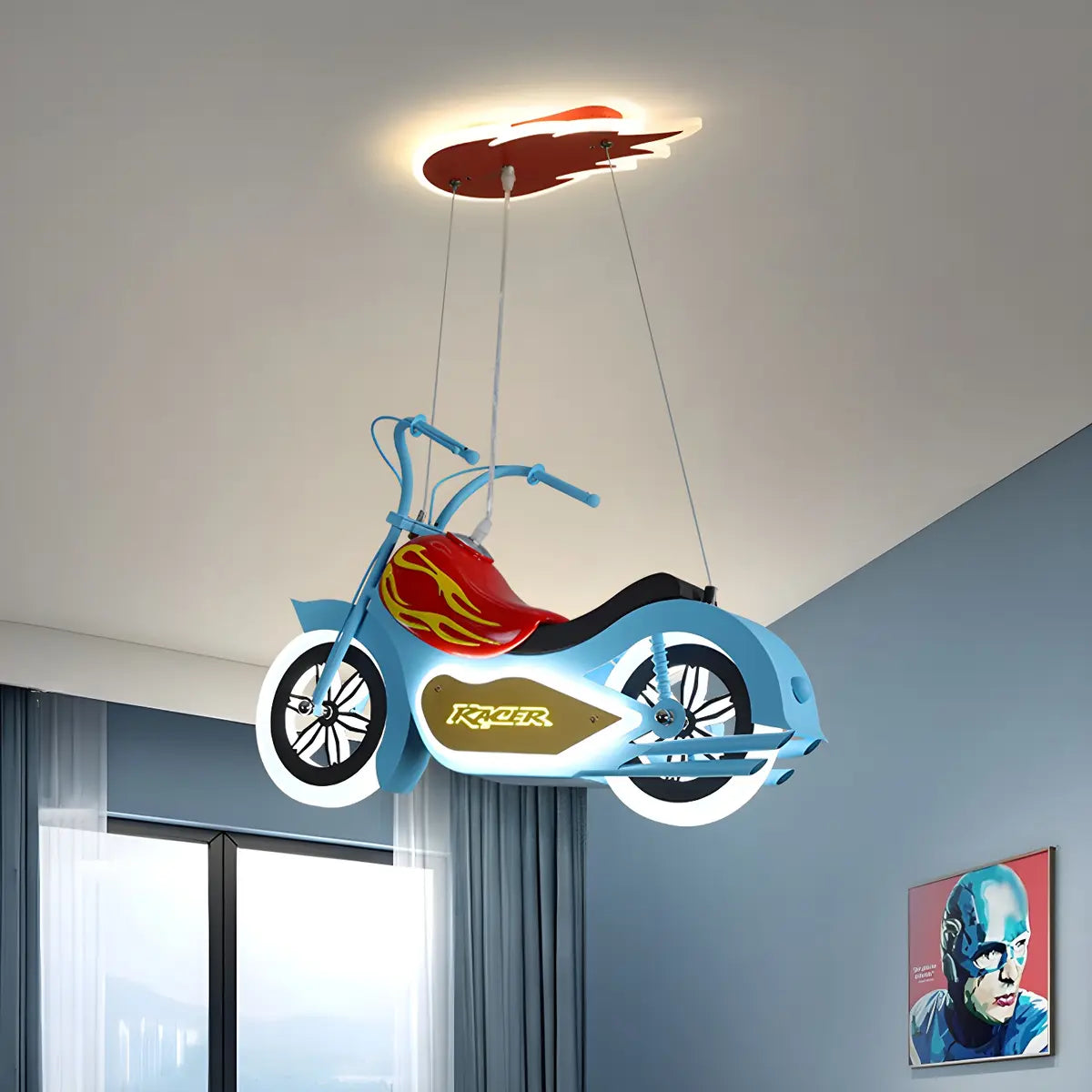 This playful youth motorcycle pendant lamp is perfect for a child's room with a playful vibe. Its bold blue and yellow flame pattern brings a sense of energy and creativity to the space.