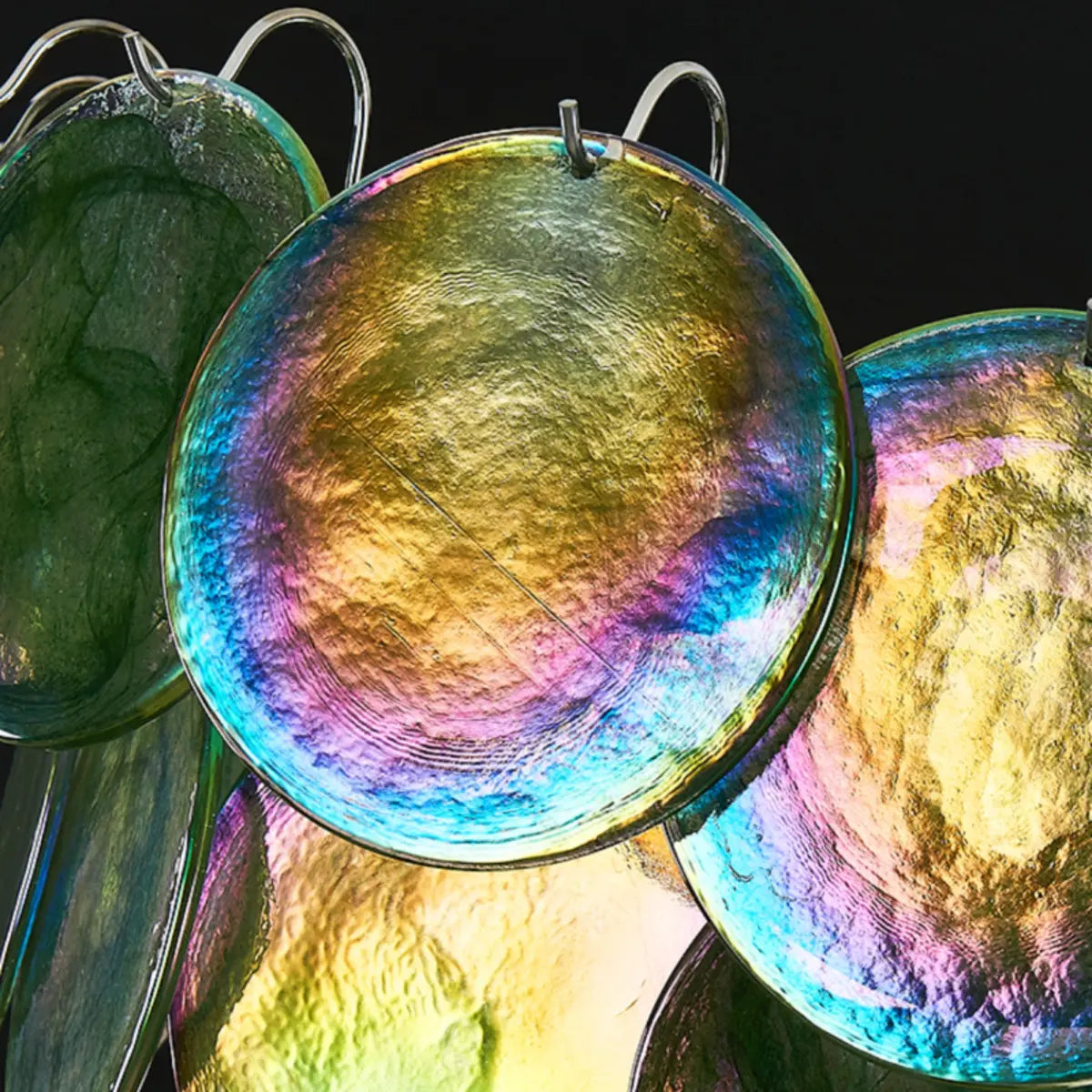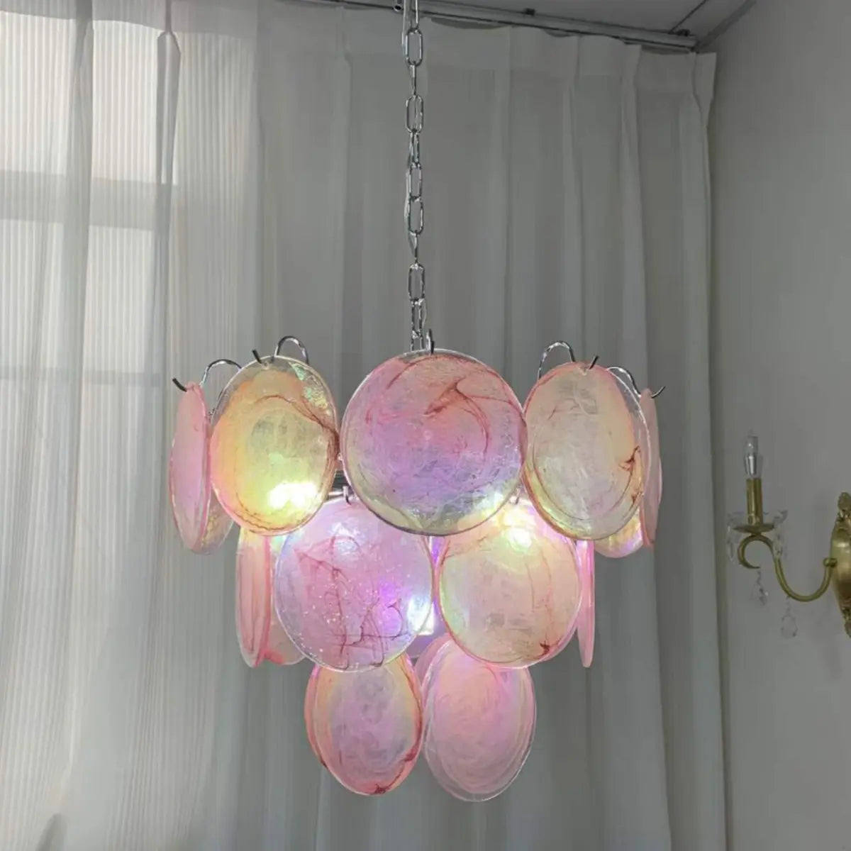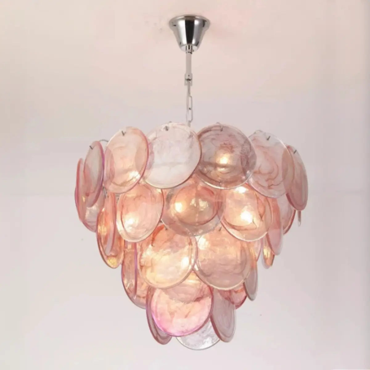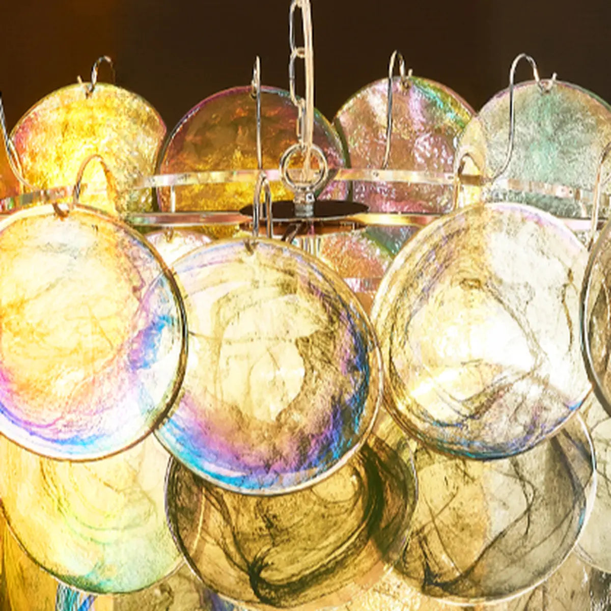 - The chandelier consists of a metal frame and multiple layers of glass disc-shaped pendants, with distinct layers that create a strong visual tension.