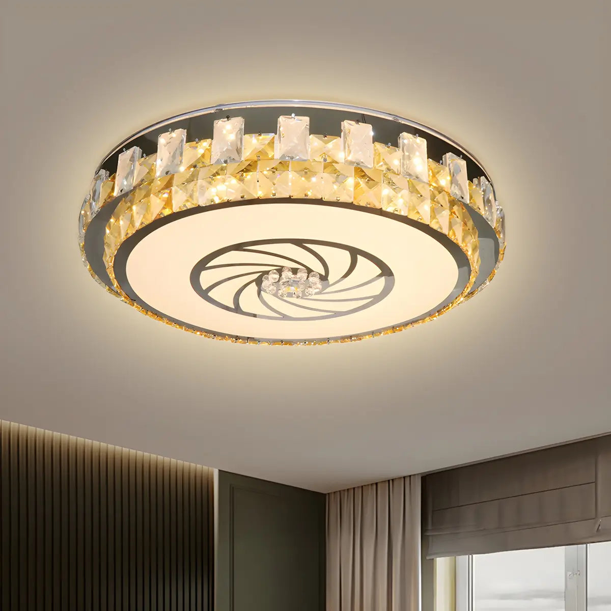 This crystal semi-recessed chandelier is like a work of art, with clear rectangular crystals surrounding an elegant swirl design, emitting brilliant light. The interweaving light and shadow of the crystal complement the nickel-colored metal, adding a touch of luxury and fashion to the room, making it an ideal choice for modern home decoration.