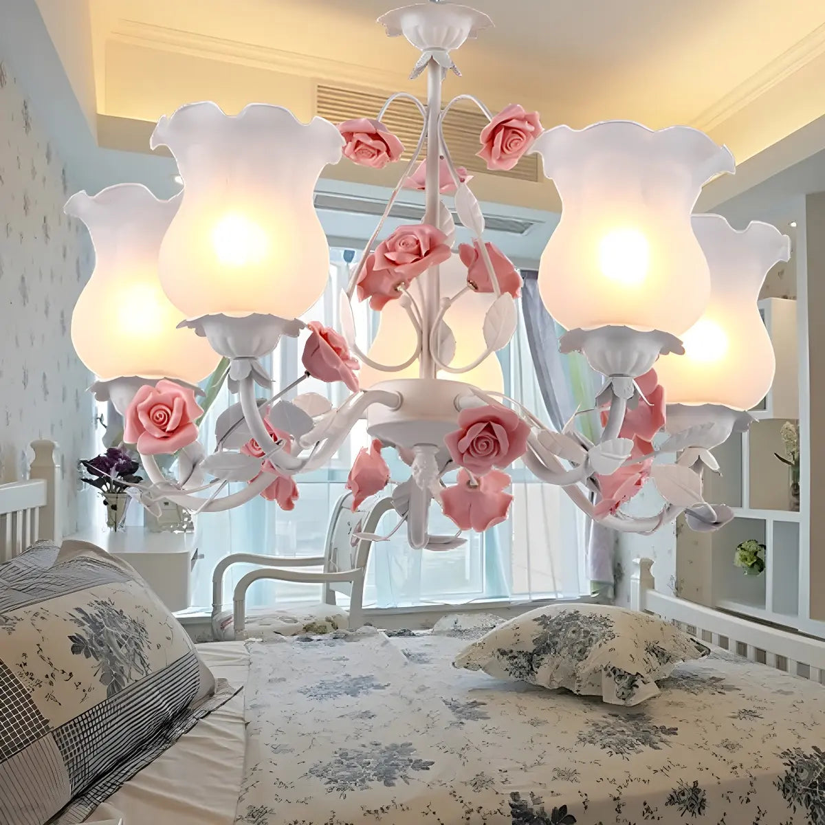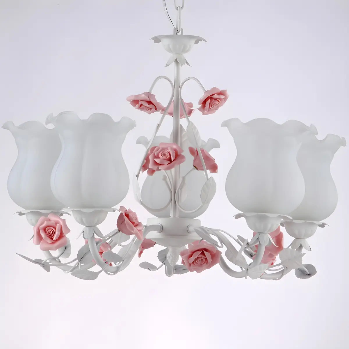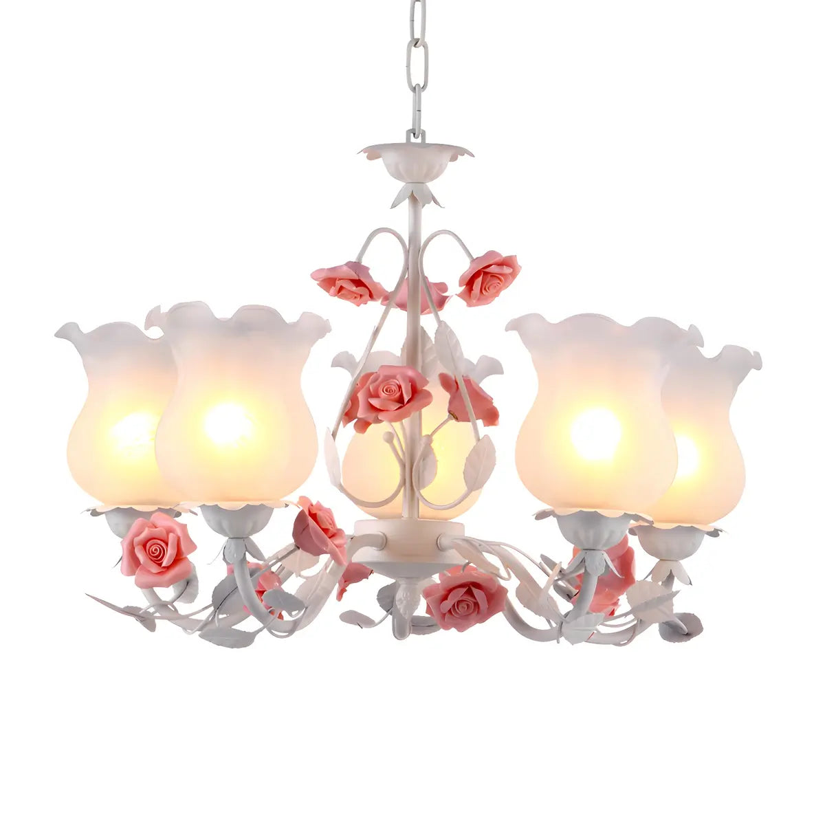 ZOWALA - Chic White Pink Rose 5-Light Frosted Glass Chandelier