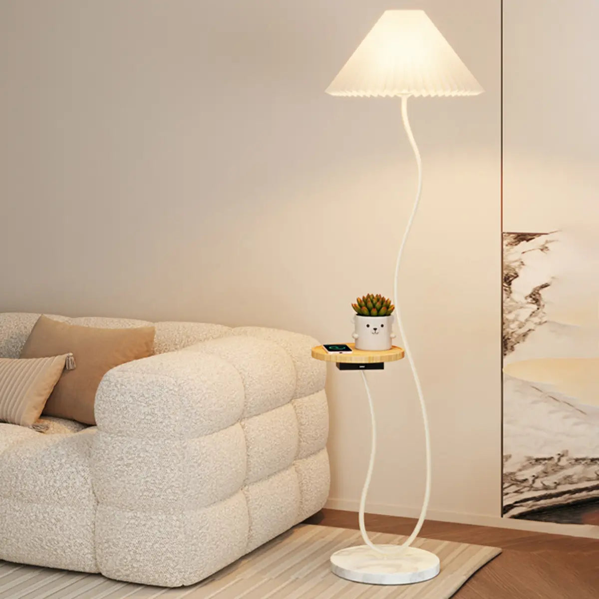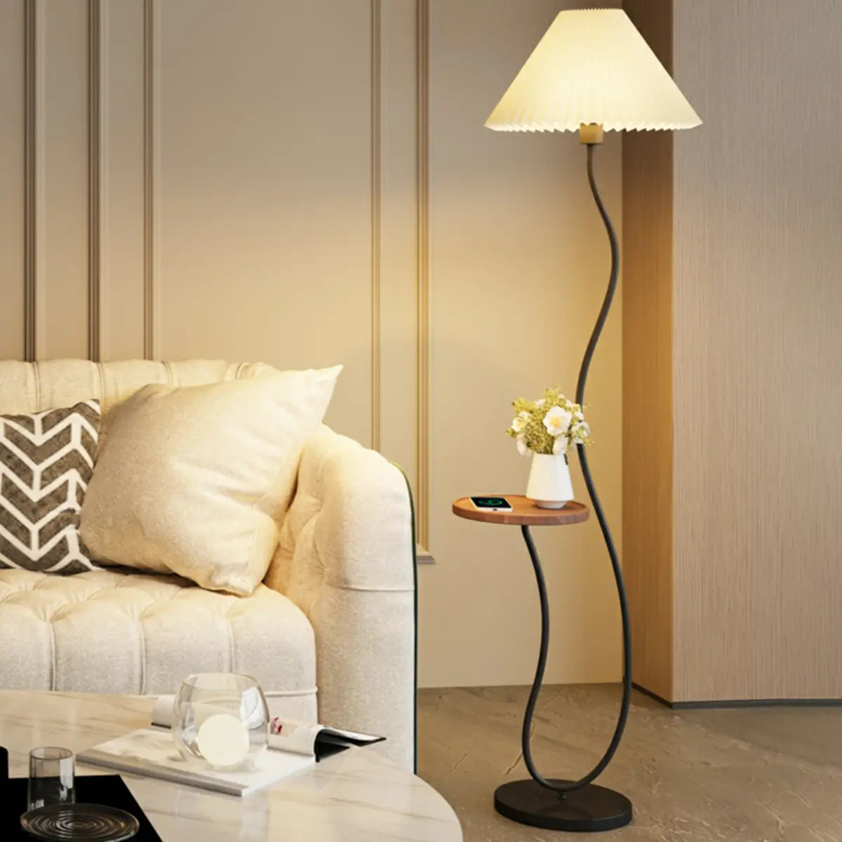 This modern floor lamp is perfect for any interior with its elegant curved design and built-in storage shelf.