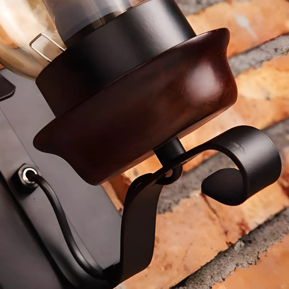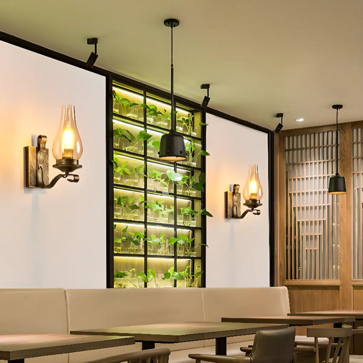 This wall lamp has an overall industrial style, with metal and geometric design combined with a clear glass lampshade to create a modern yet retro decorative effect.