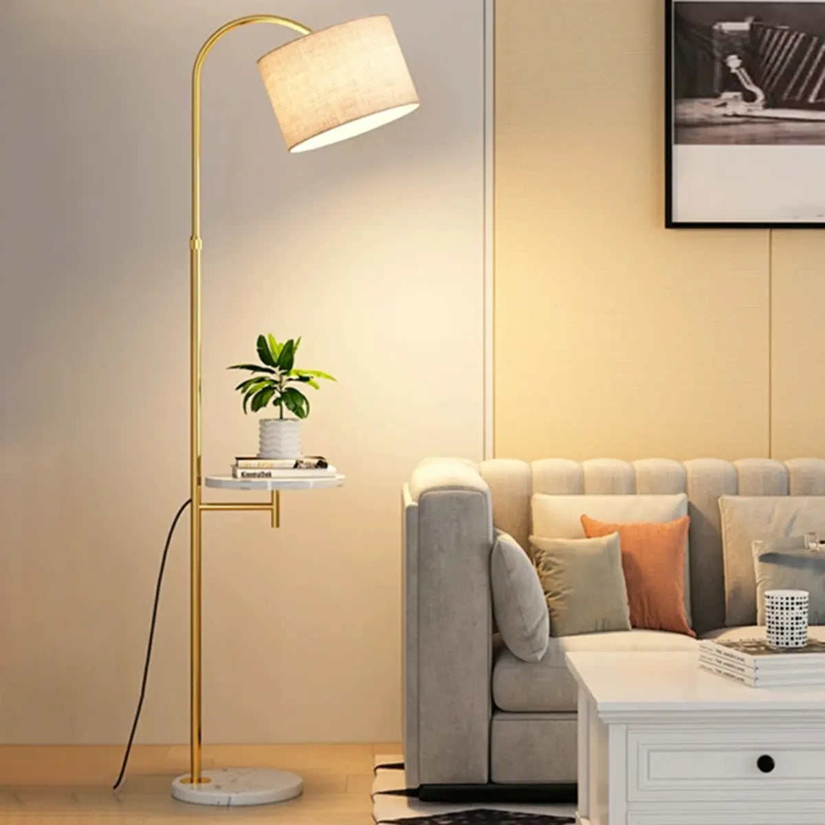 This functional floor lamp features a modern metal design with a sophisticated gold finish, adding a touch of elegance to your home. The slender gold frame is perfectly combined with the high-quality fabric lampshade, presenting an elegant decorative effect that suits any modern home style.