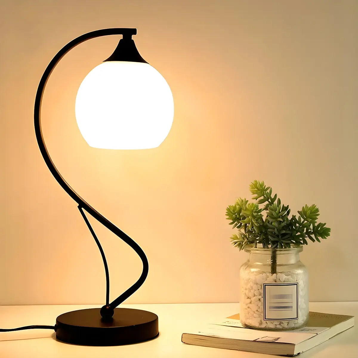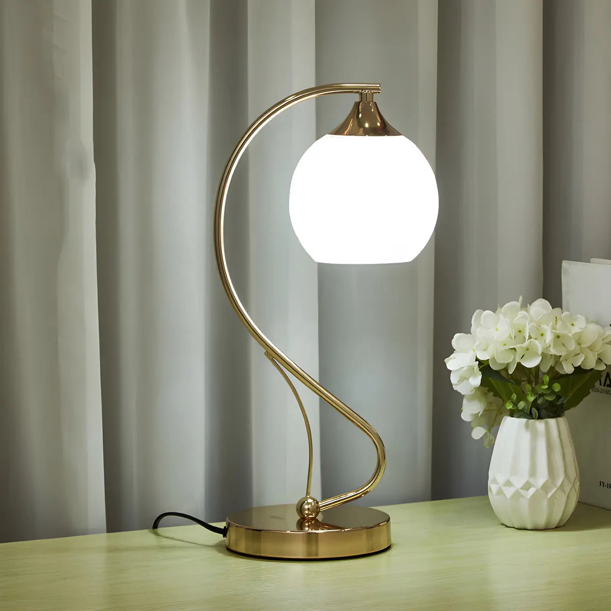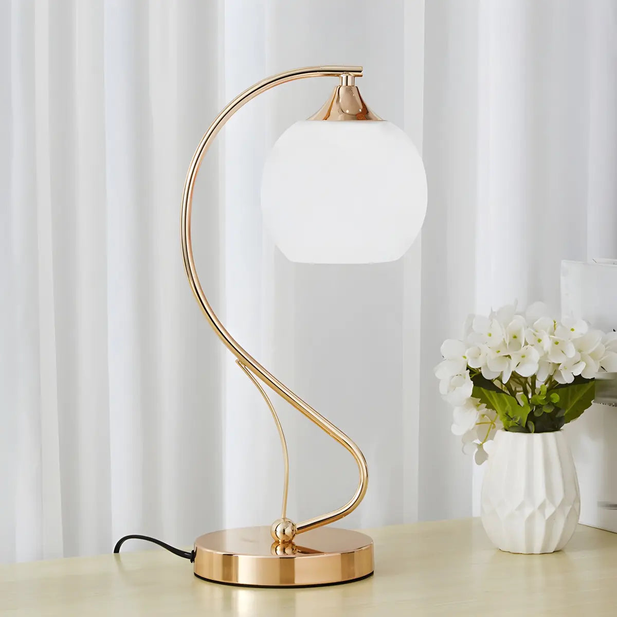 This modern table lamp features an elegant curved metal base with a frosted glass shade, adding a touch of modern art to your home space.
