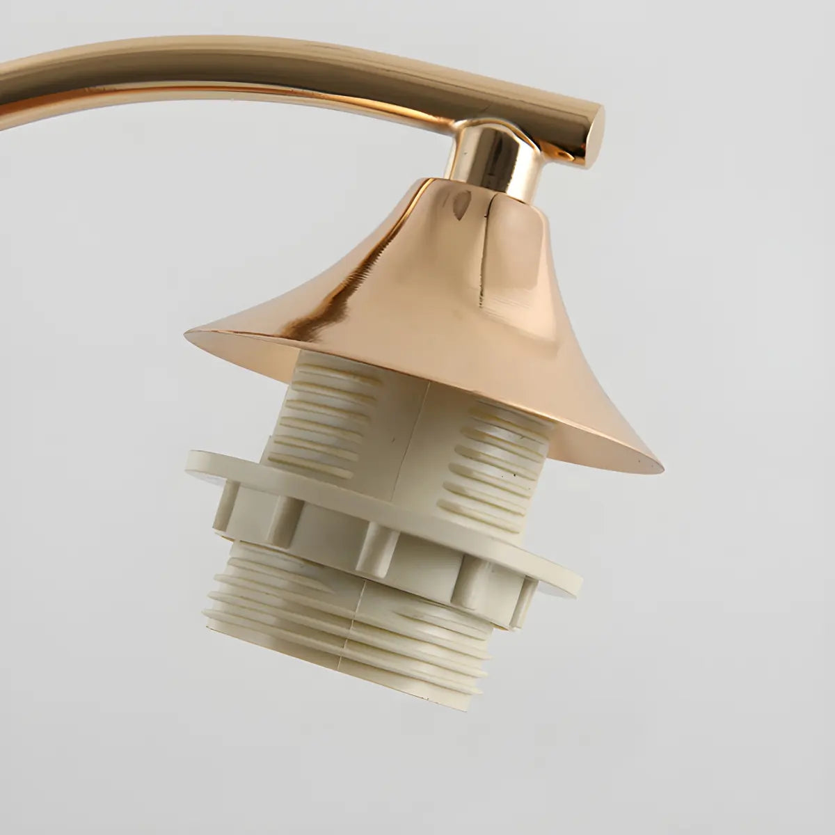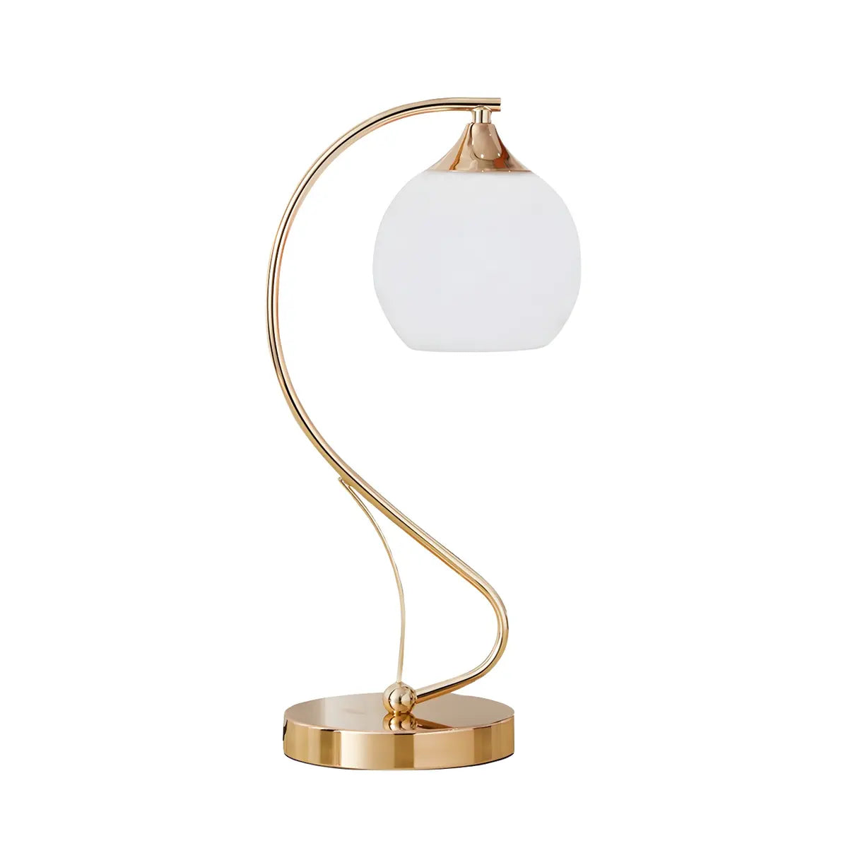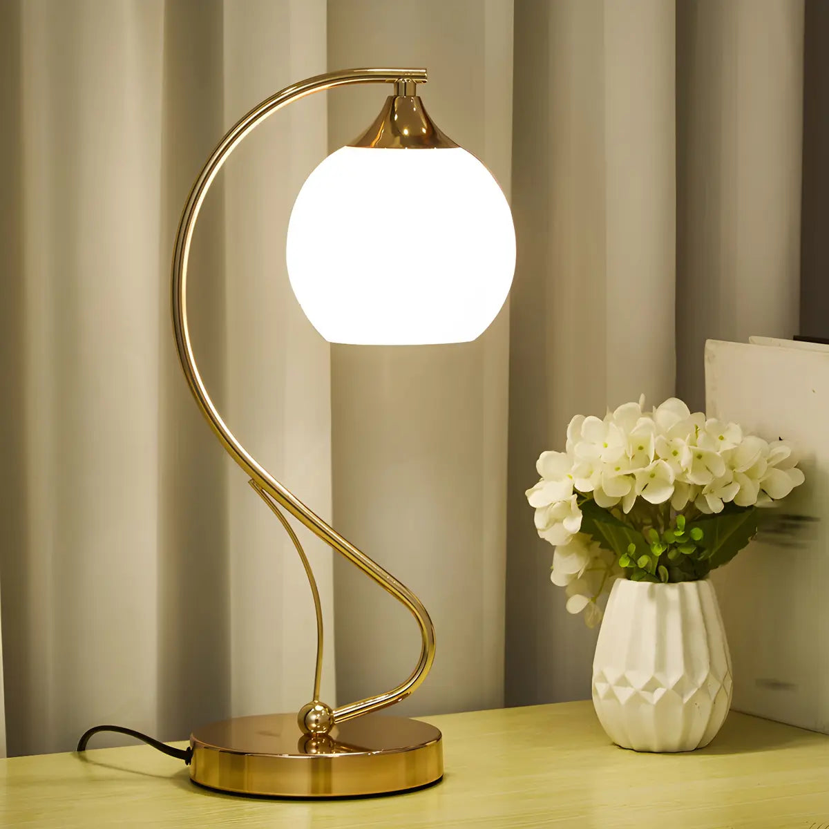 This modern table lamp features an elegant curved metal base with a frosted glass shade, adding a touch of modern art to your home space.