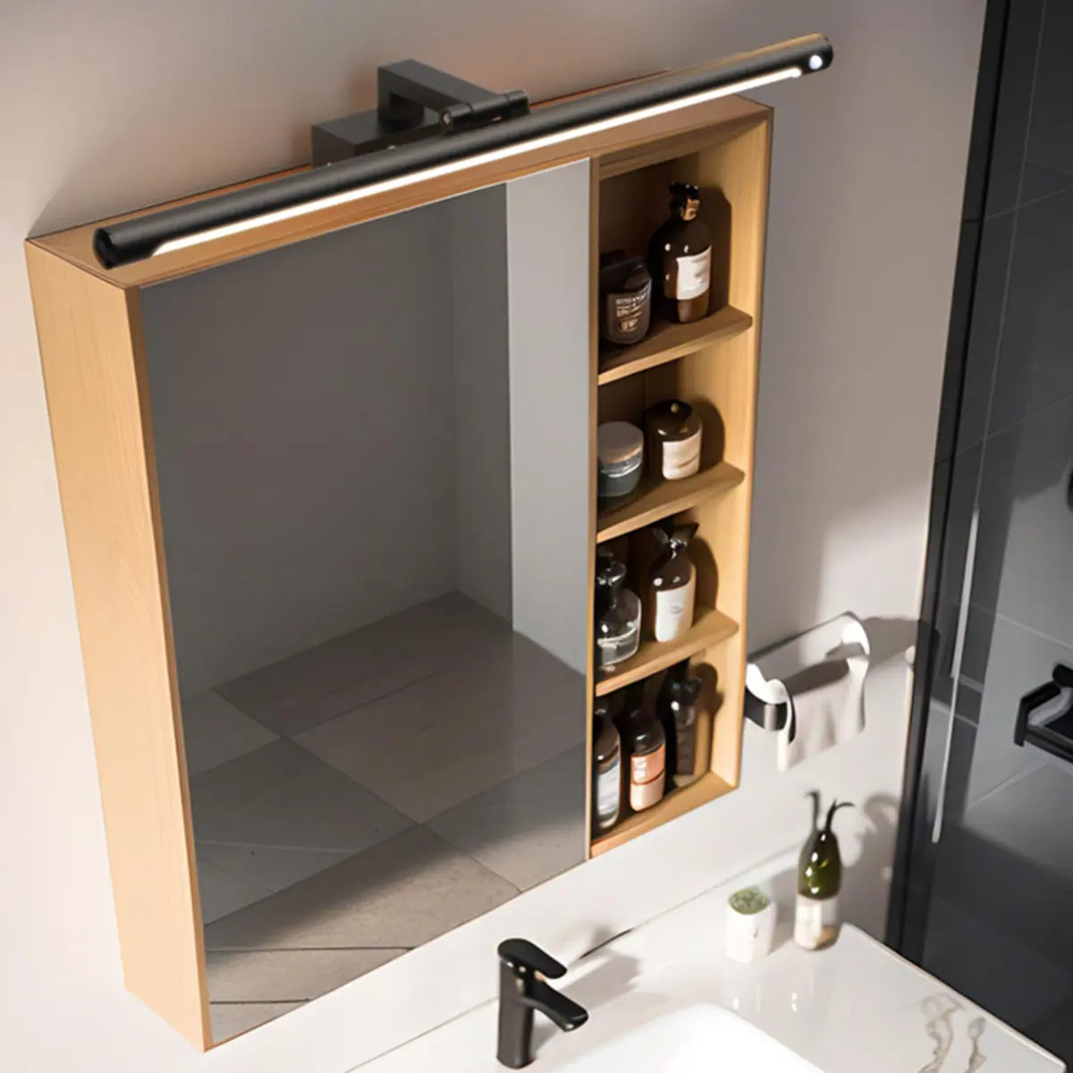 This bathroom mirror cabinet lamp has a simple and stylish design, and the cylindrical appearance presents a modern style, reflecting a modern temperament. The cylindrical mirror is cleverly combined with the wooden storage cabinet to add a fashionable element to the bathroom.