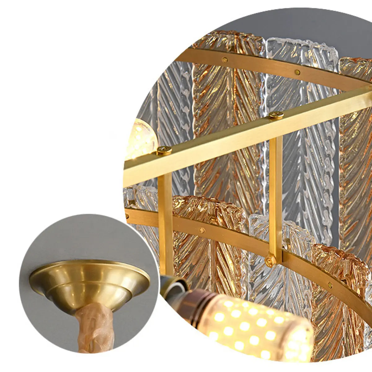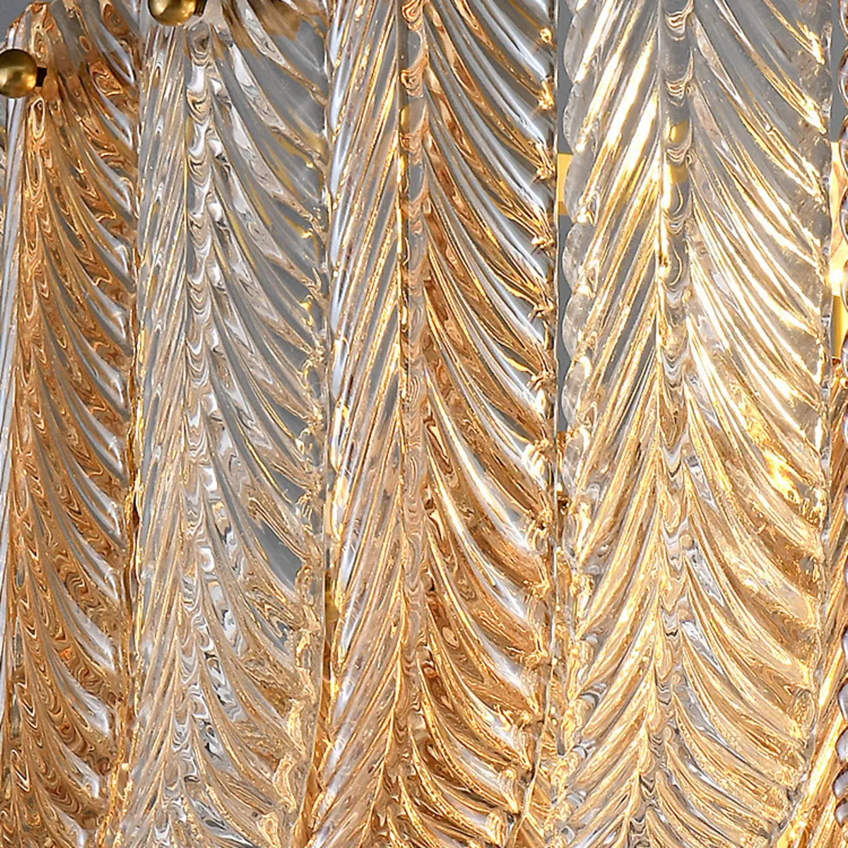 This chandelier has an extraordinary beauty with its cascading feather-like design. The amber glass shade shines softly under the light, adding warmth and elegance to your home.