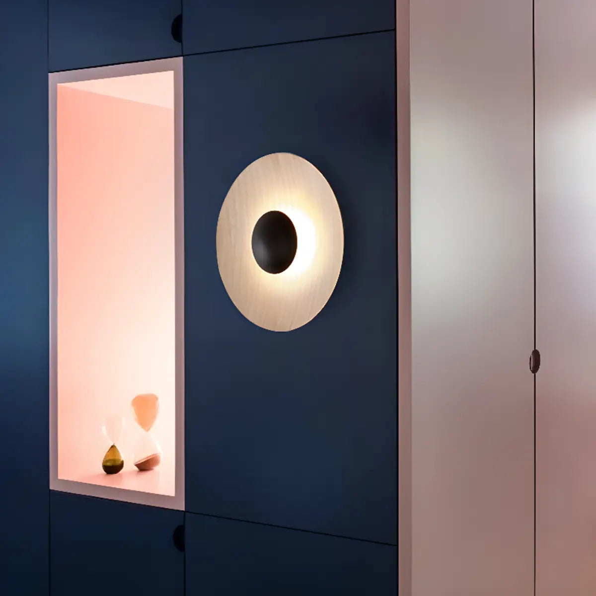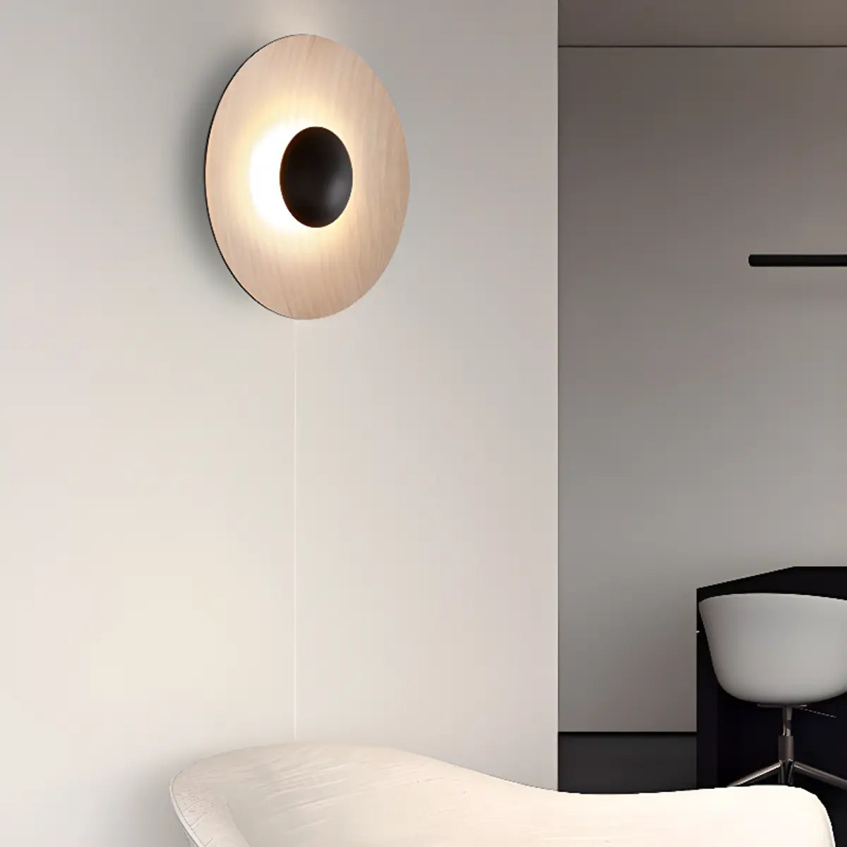 This wall lamp features a modern geometric design. The delicate round shape is perfectly combined with the black, white, and wood color options to suit a variety of decorative styles.