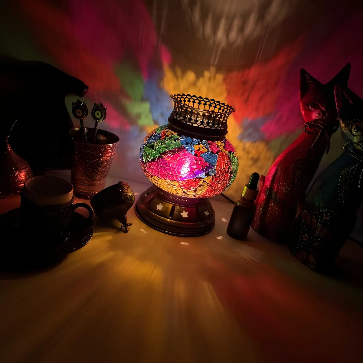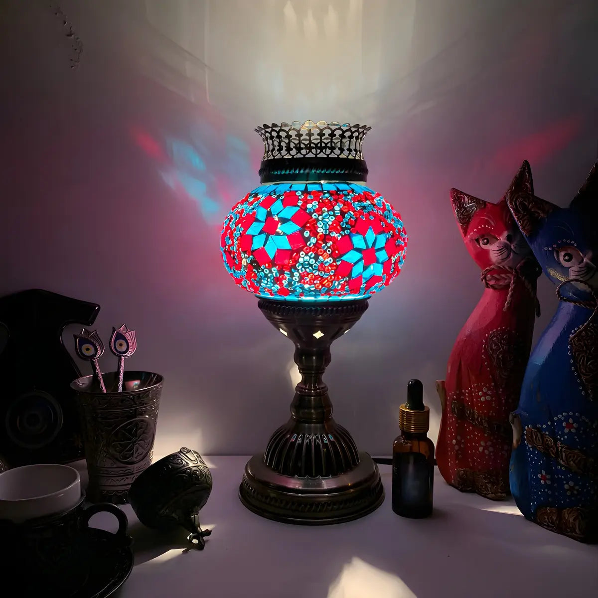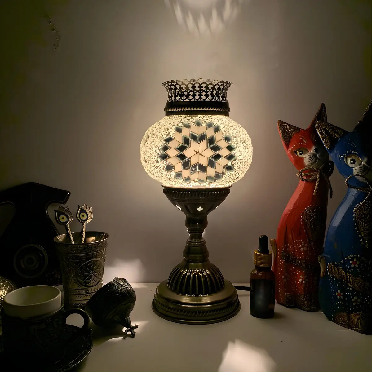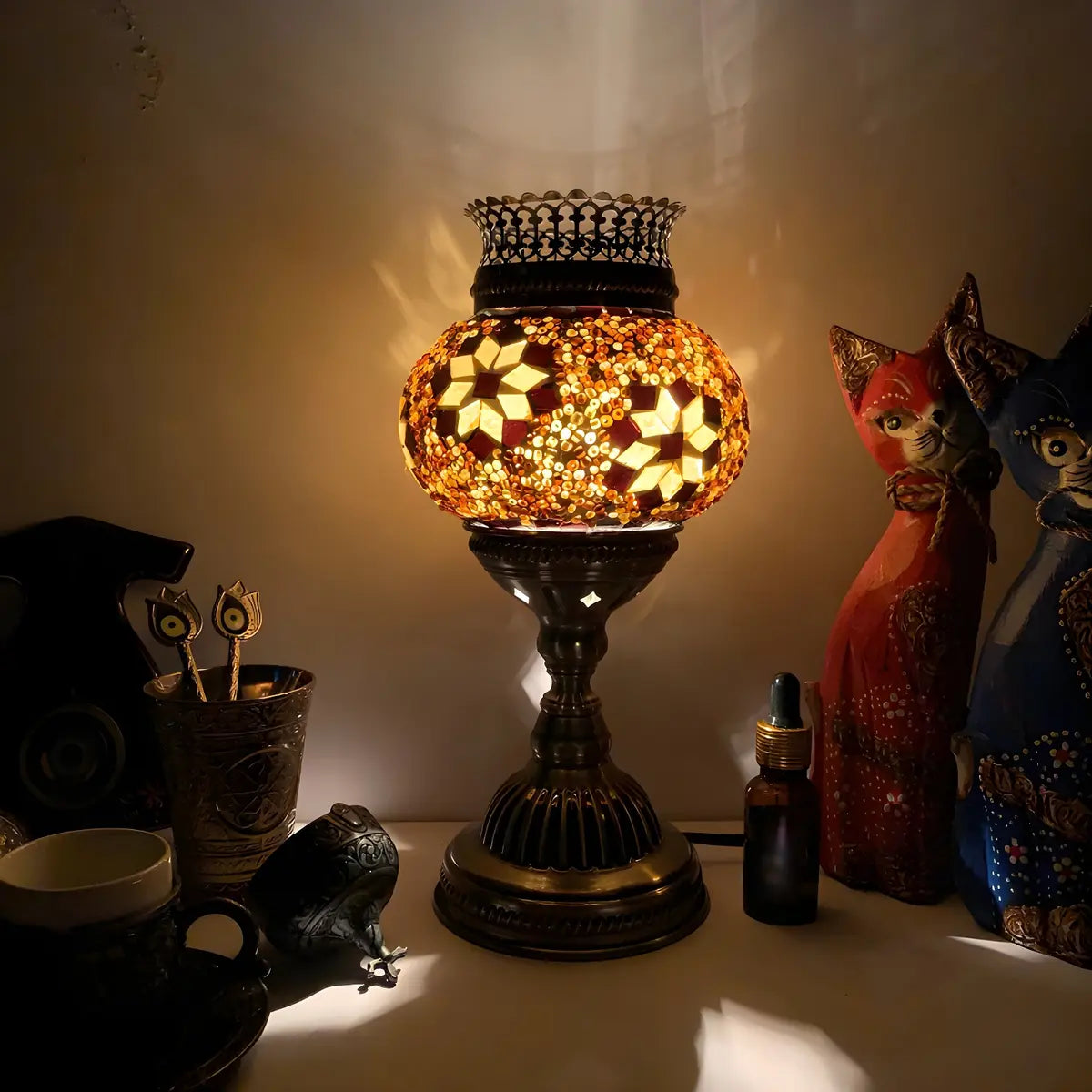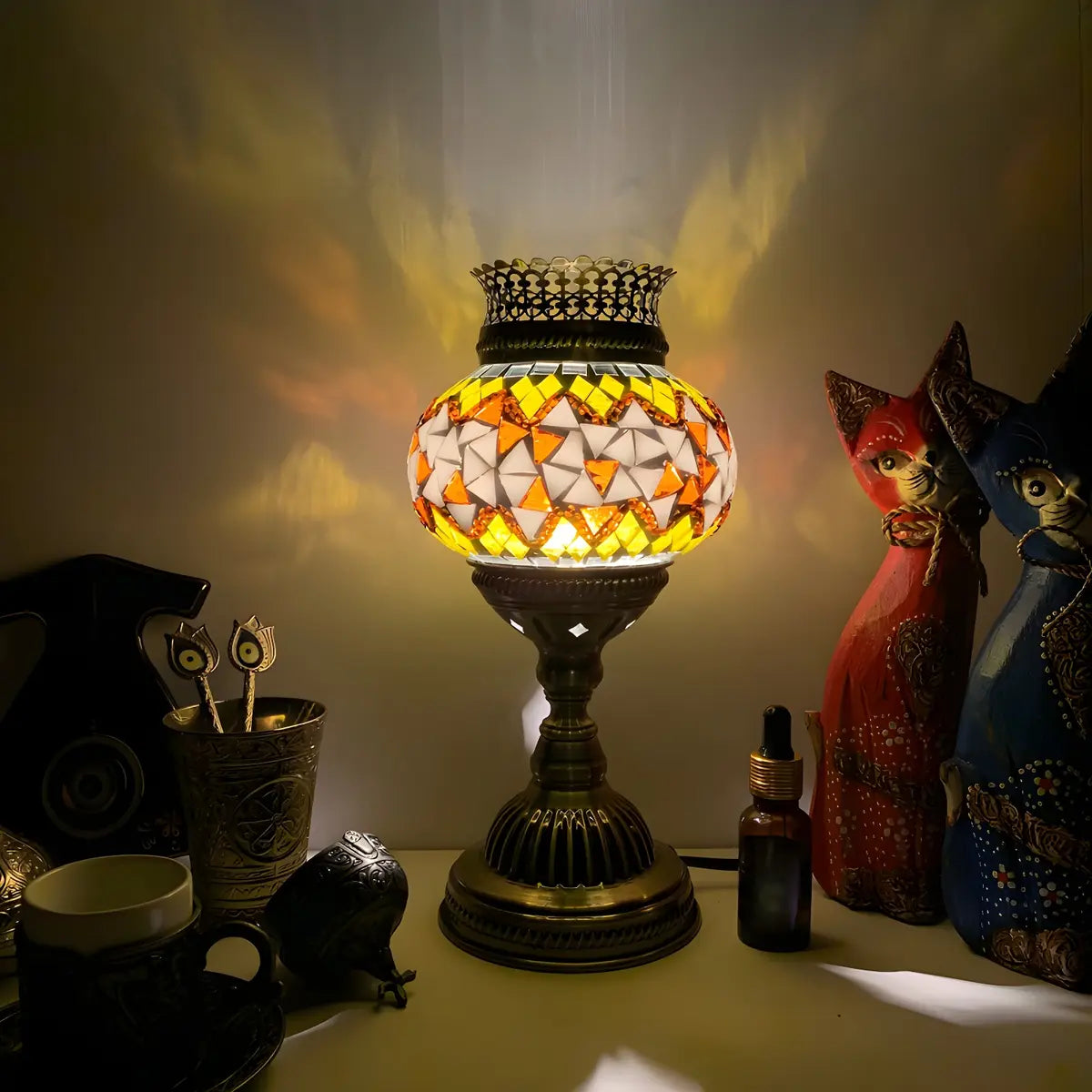 This traditional Moroccan metal and glass table lamp combines exoticism with exquisite craftsmanship to create a one-of-a-kind visual experience.