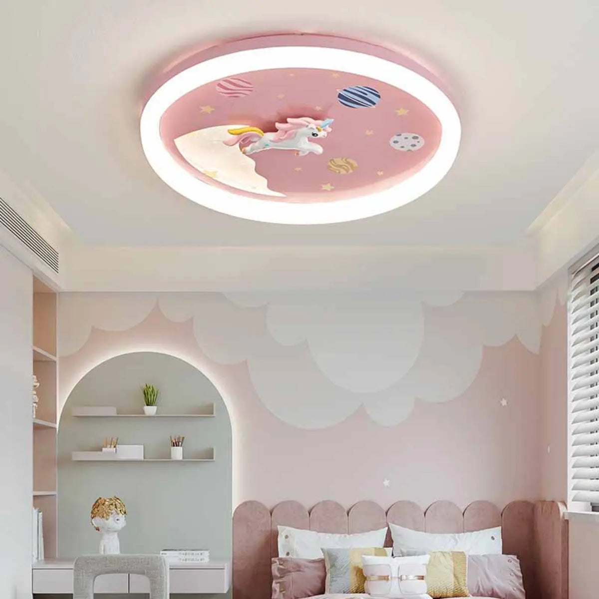 - The unique unicorn design combines perfectly with the soft pink hue, adding to the childlike fun and appeal of the room.