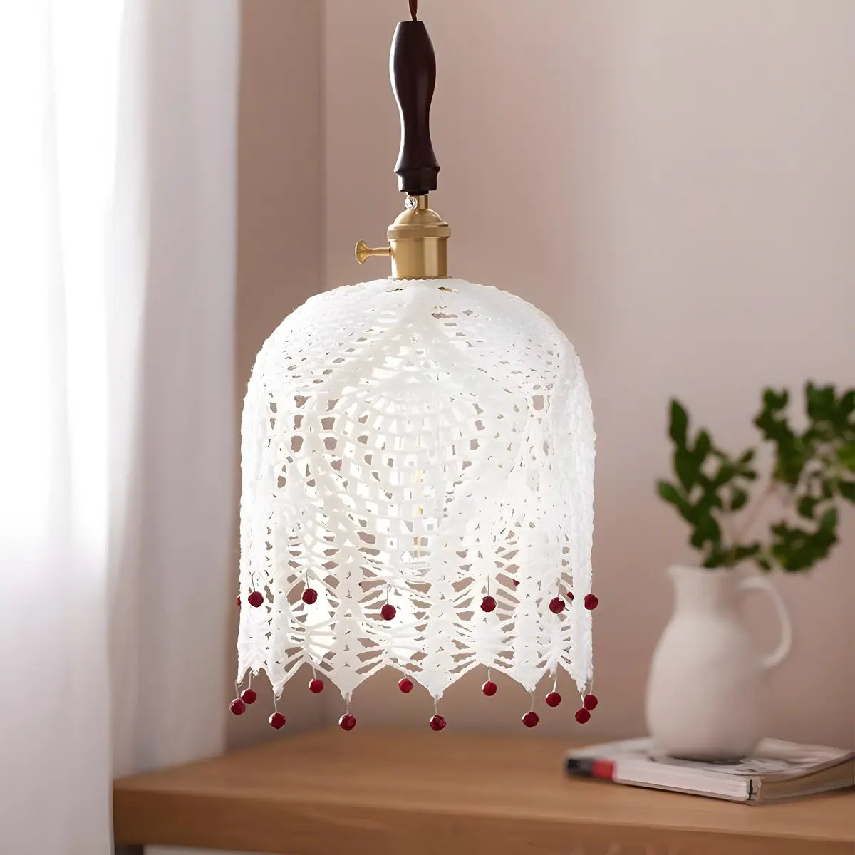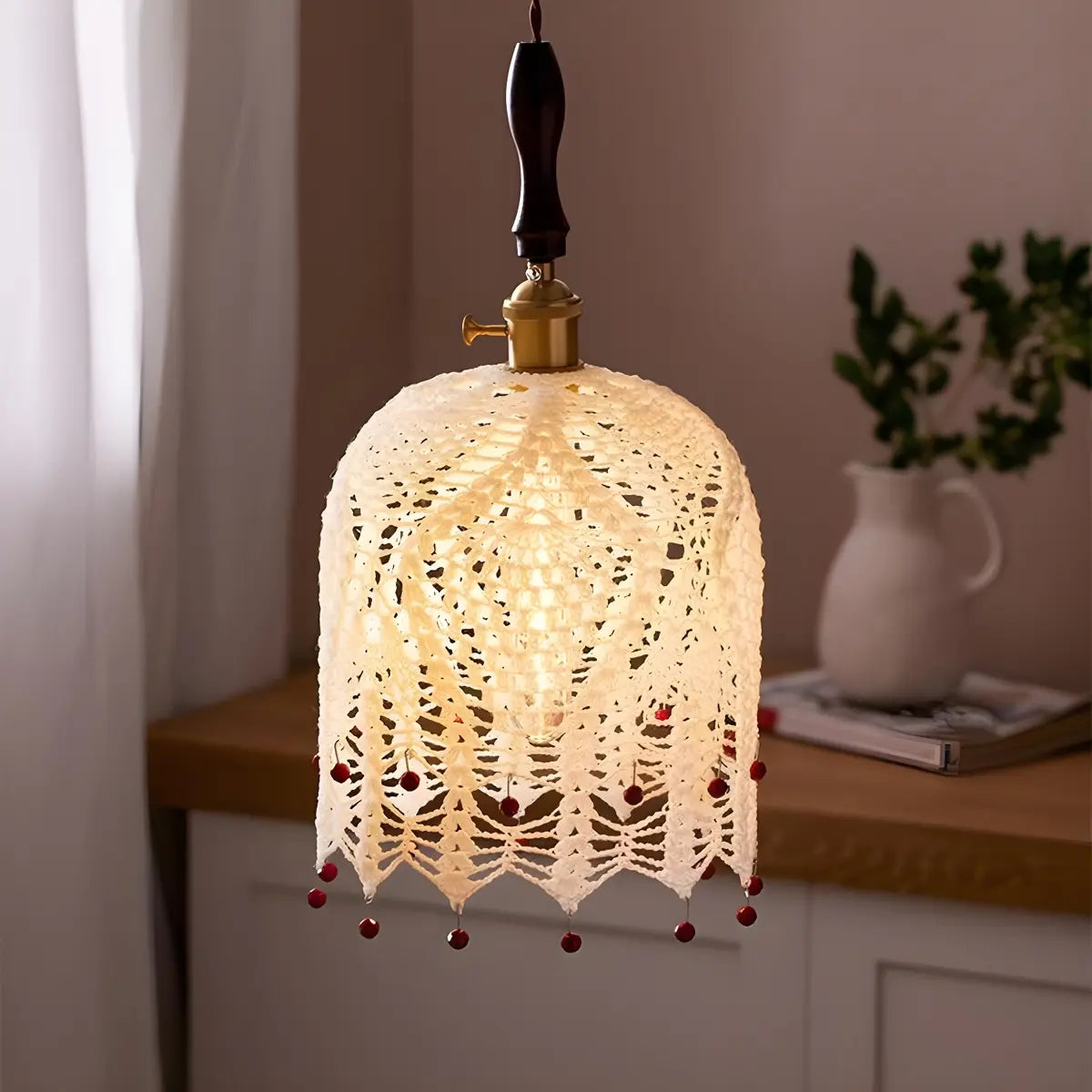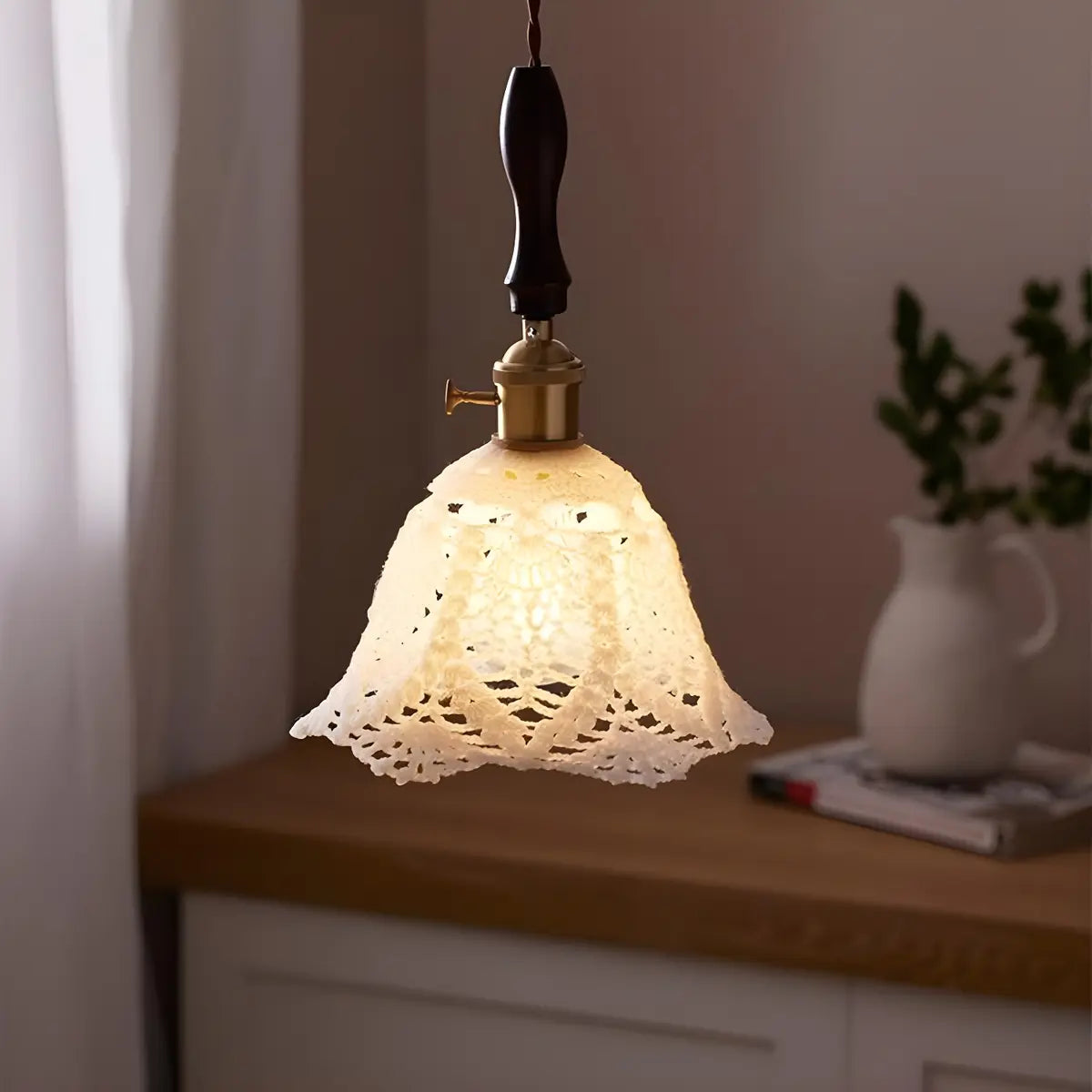 Featuring an elegant patterned fabric shade, this pendant lamp provides soft light, adding a nostalgic and artistic touch. Its unique textile texture appears as light as petals under the light, instantly elevating any space into a warm and cozy corner.