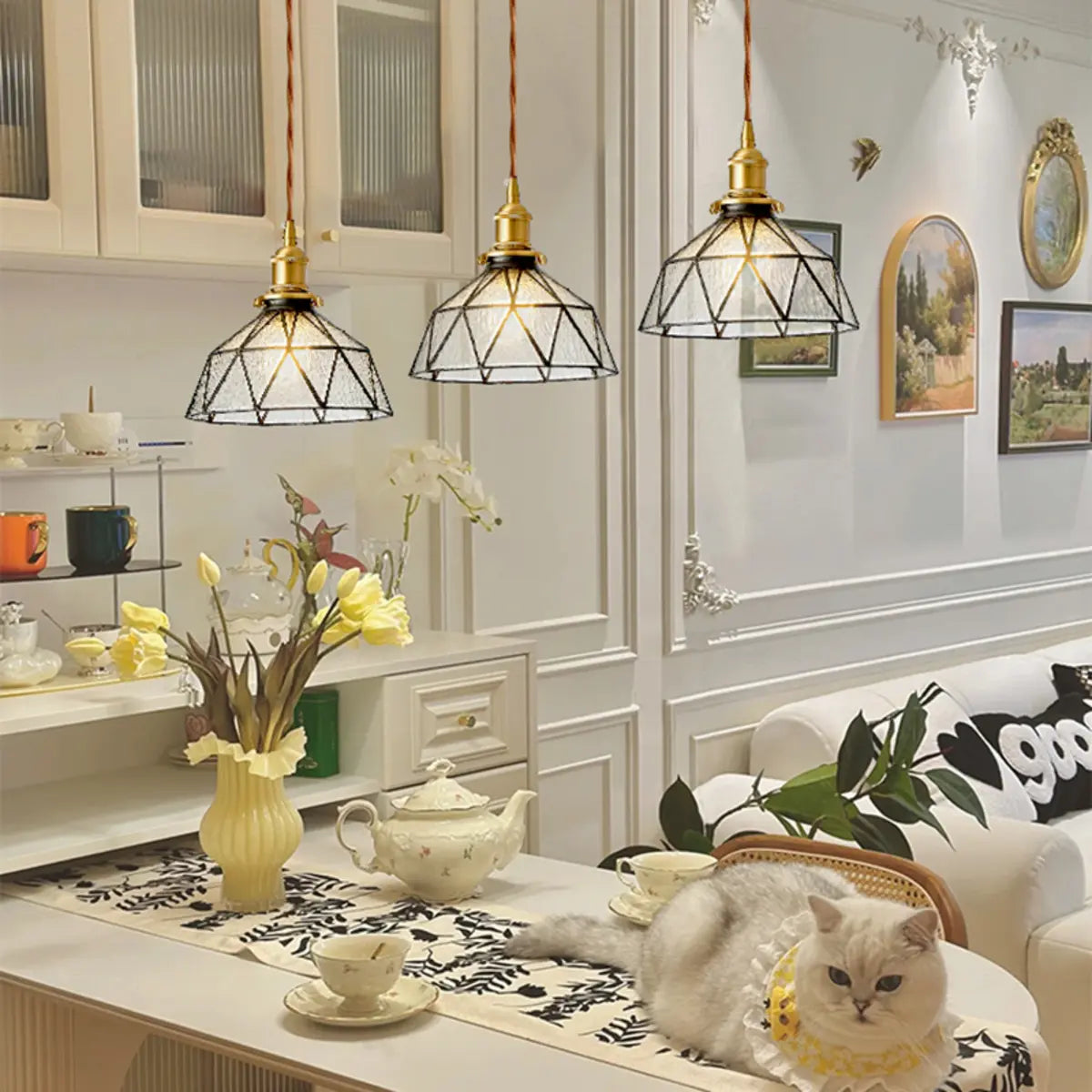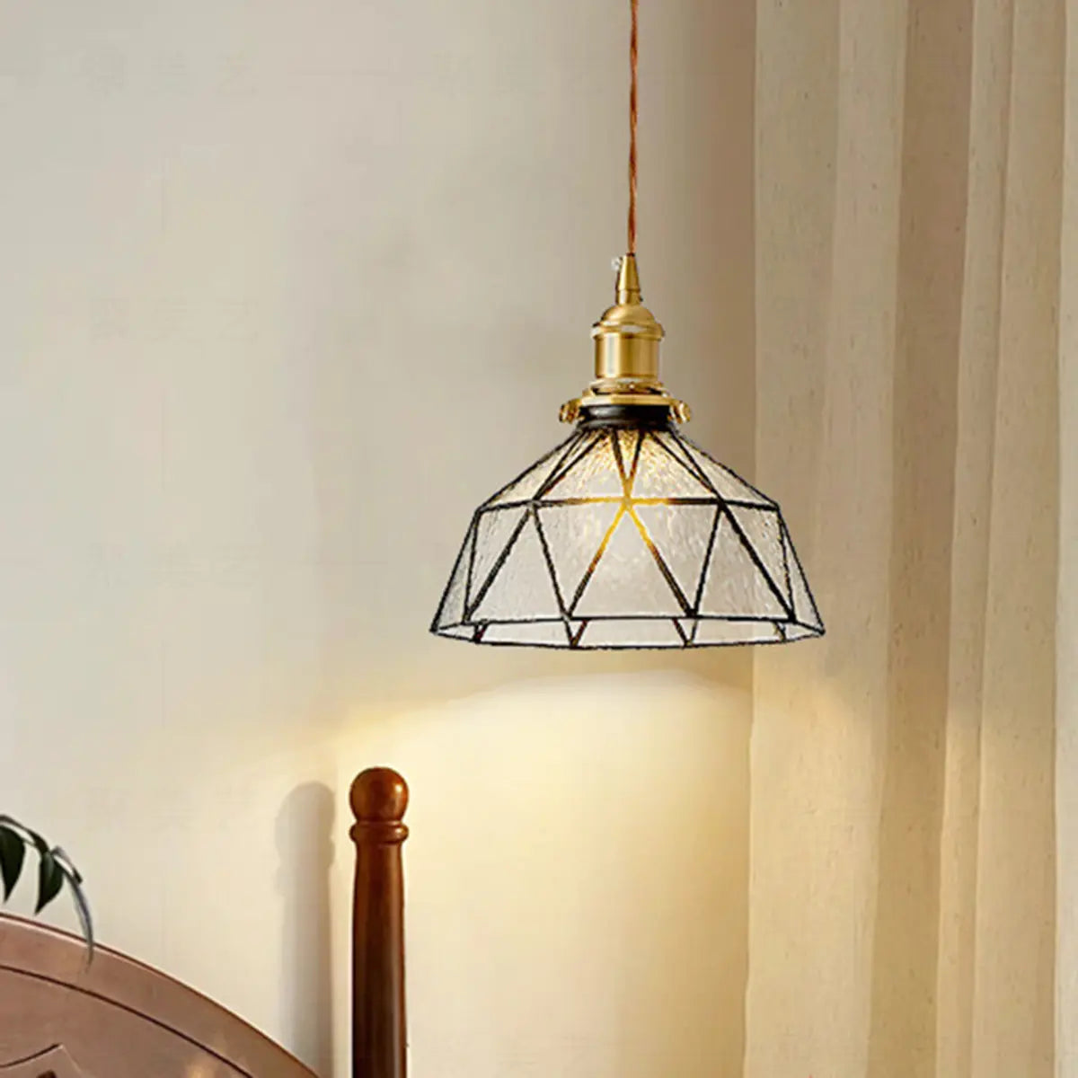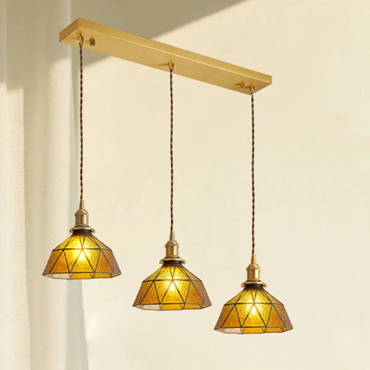 This pendant lamp features a unique amber geometric glass shade, and the gold metal structure adds a touch of vintage style. The light reflects through the shade to create a soft and warm glow, instantly enhancing the atmosphere of the kitchen, while also being an artistic decoration at home.