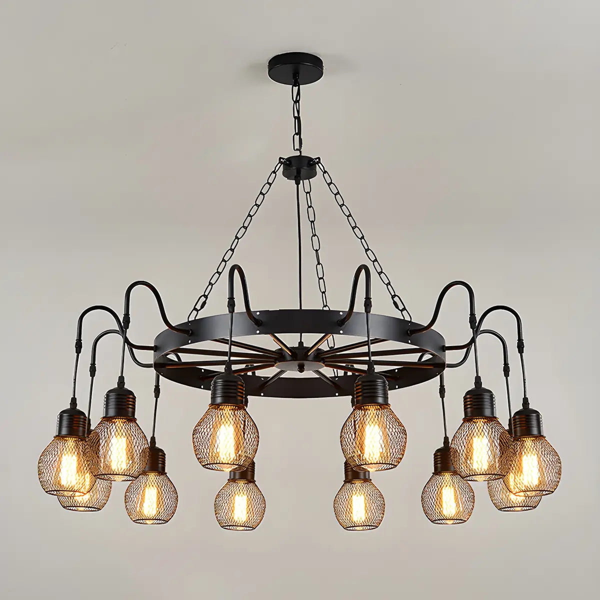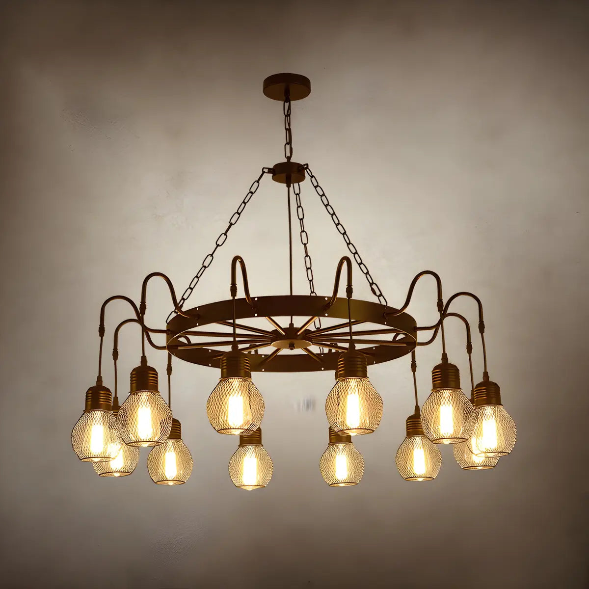 This unique wheel-shaped chandelier is full of industrial style, with a metal mesh structure that presents eye-catching contour lines. It is paired with 12 Edison bulbs, exuding a retro and rustic light charm.