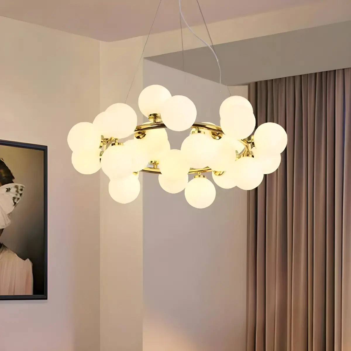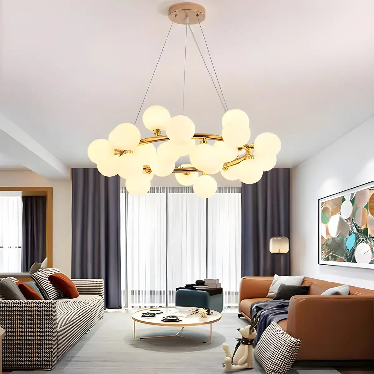 This modern bubble chandelier brings your living room to life with its simple circular design, creating an eye-catching focal point.