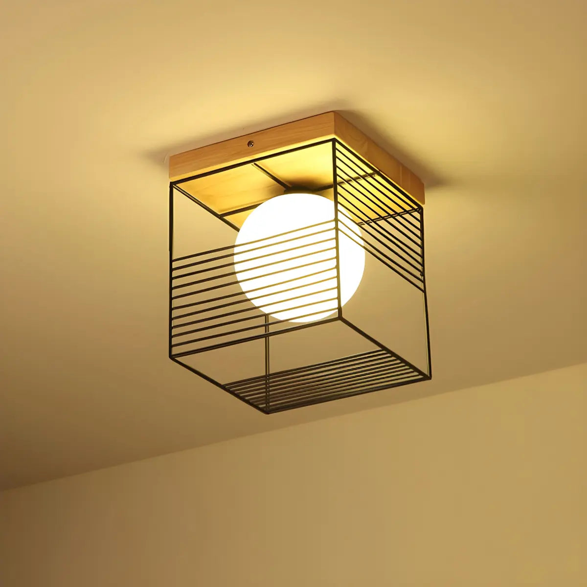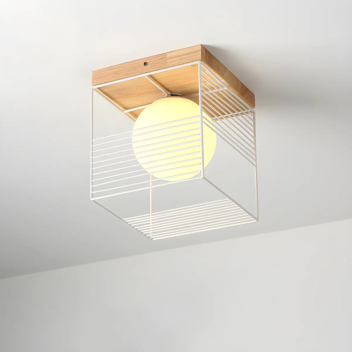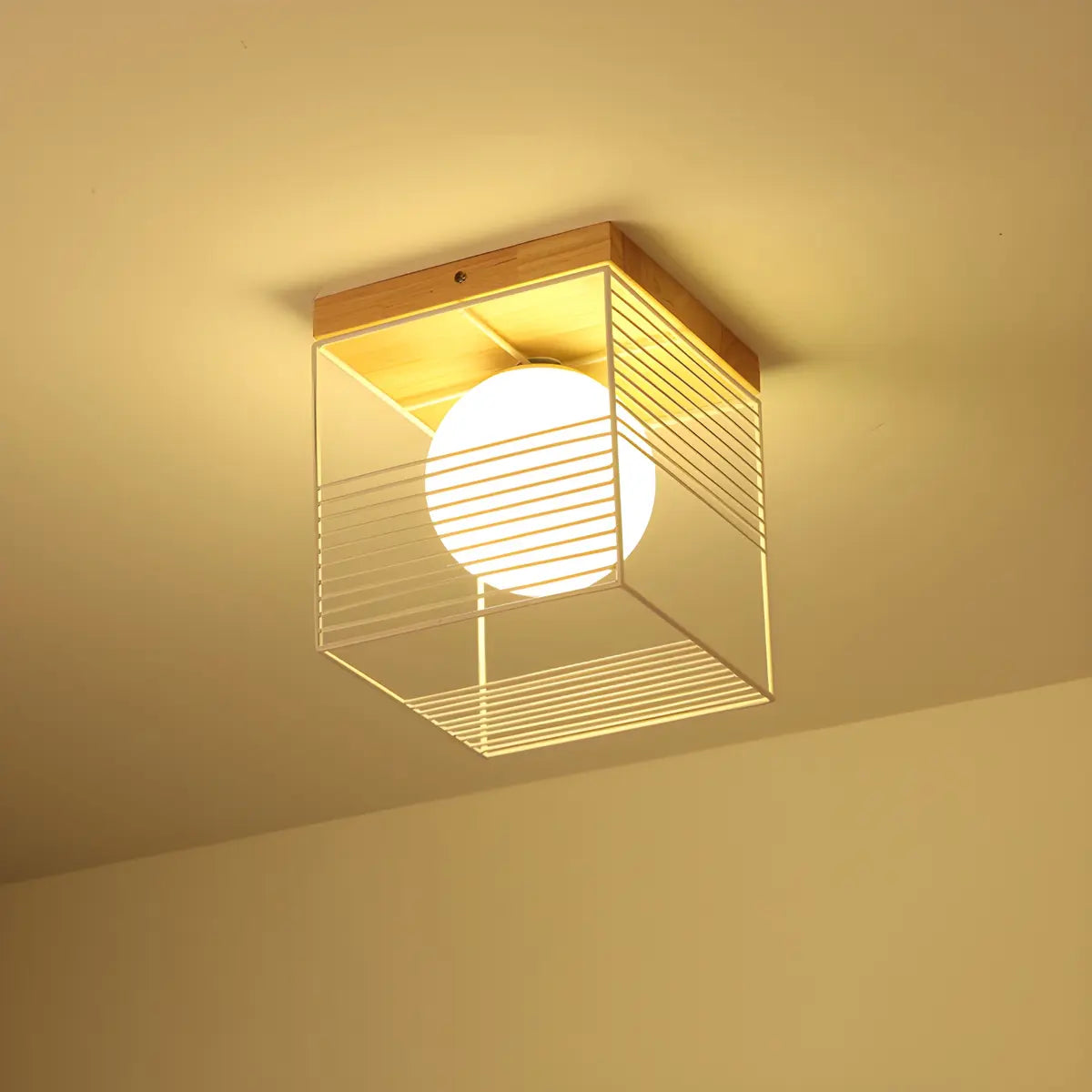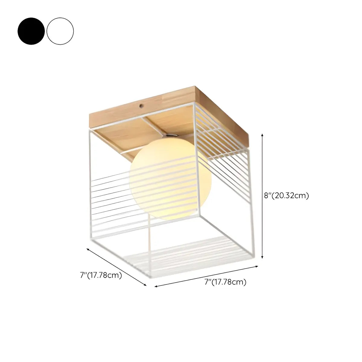 ZOWALA - Wood White Metal Cage Glass Globe Flush Mount Lamp