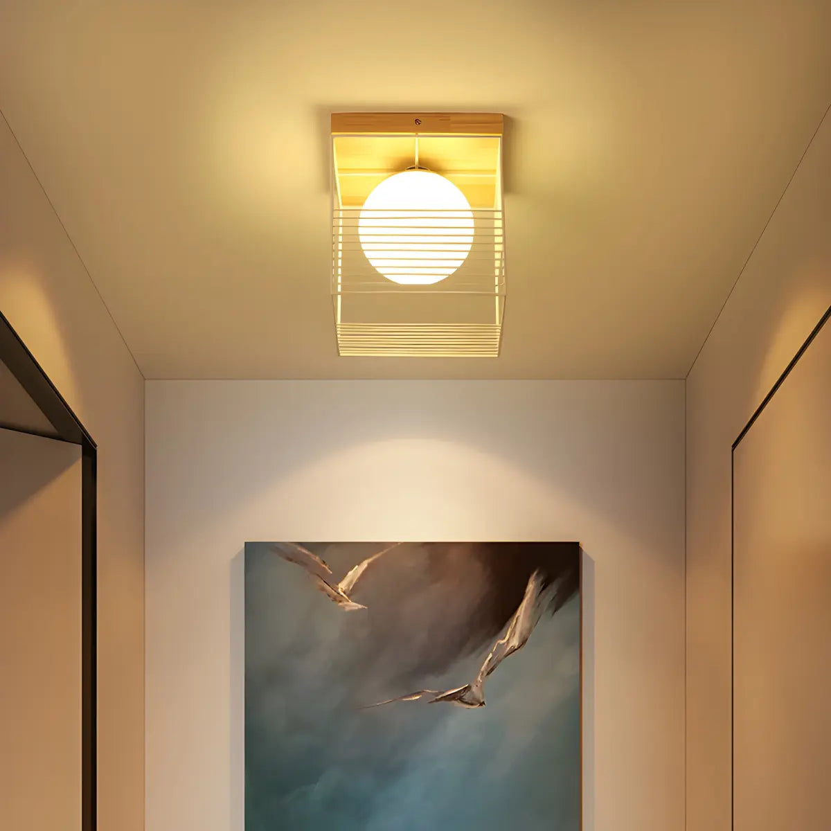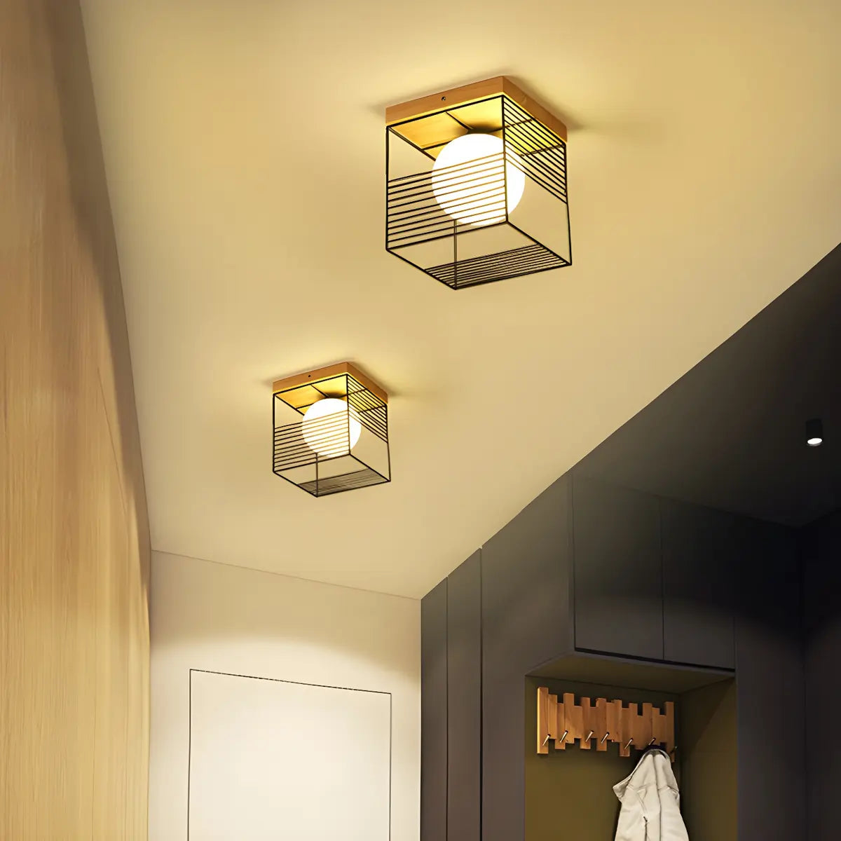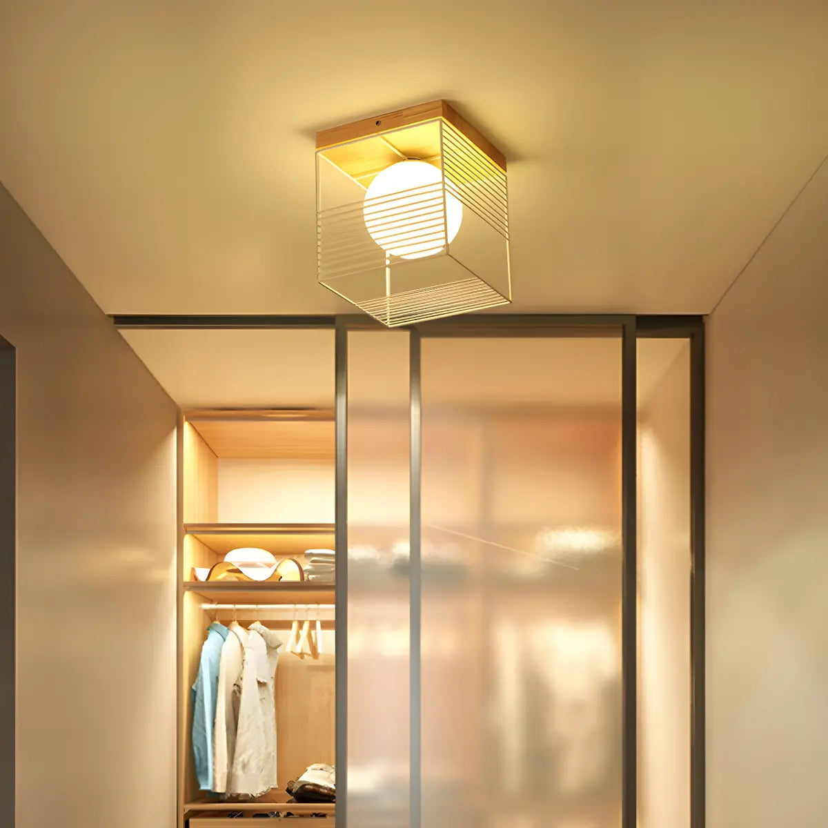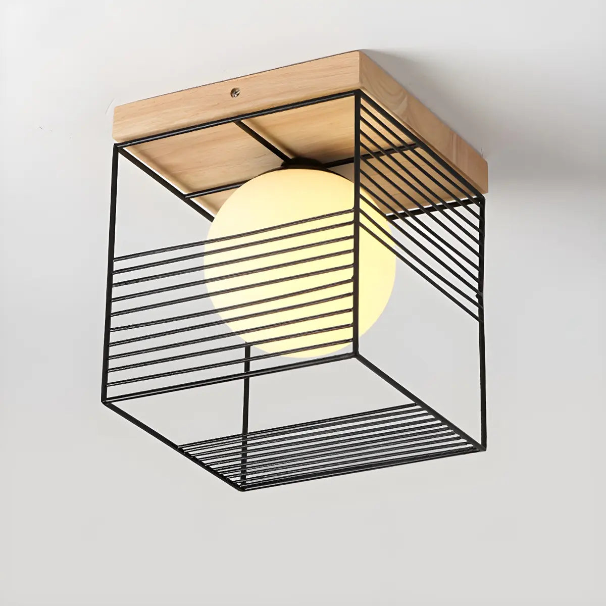 ZOWALA - Wood White Metal Cage Glass Globe Flush Mount Lamp